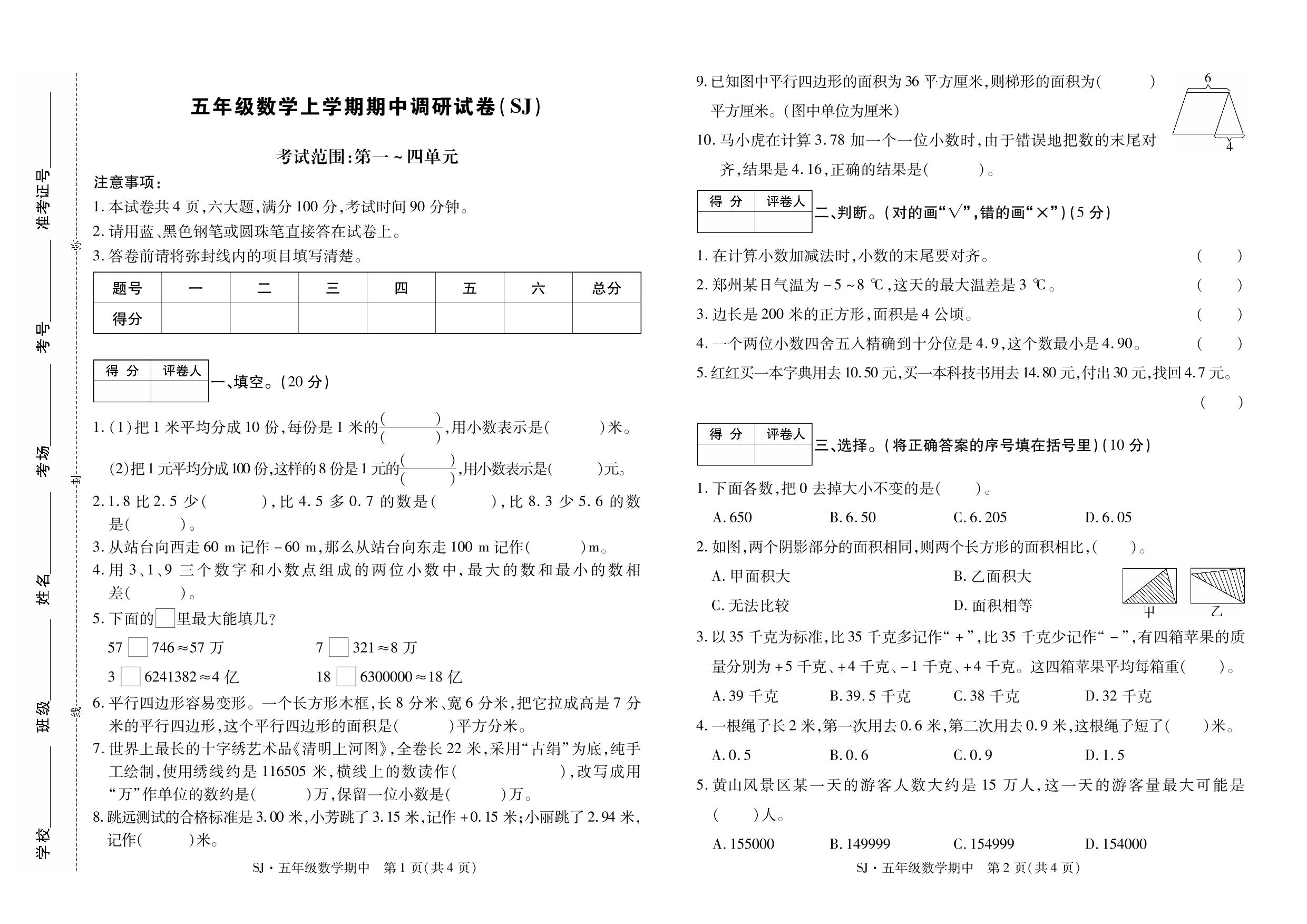 五年级数学苏教版上册期中卷