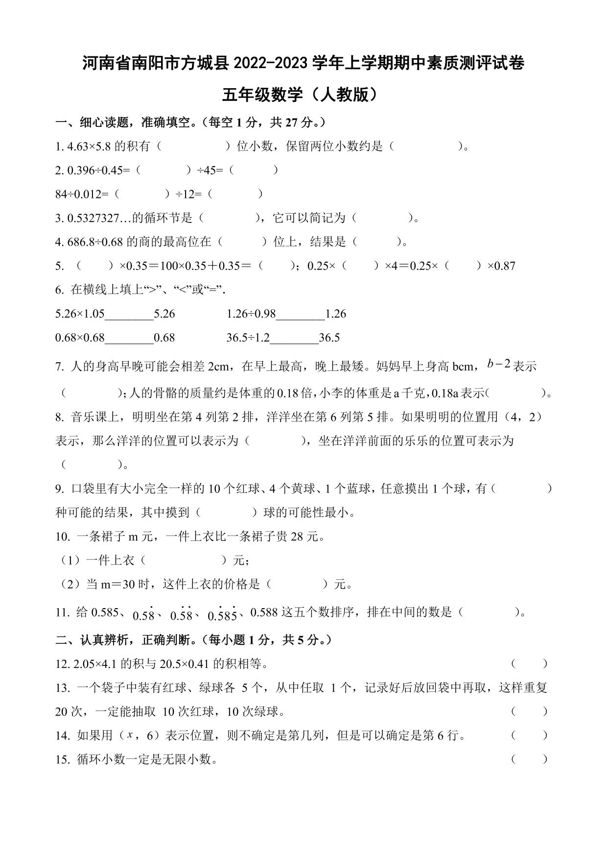 河南省南阳市方城县2022-2023学年上学期期中素质测评试卷五年级数学(人教版)