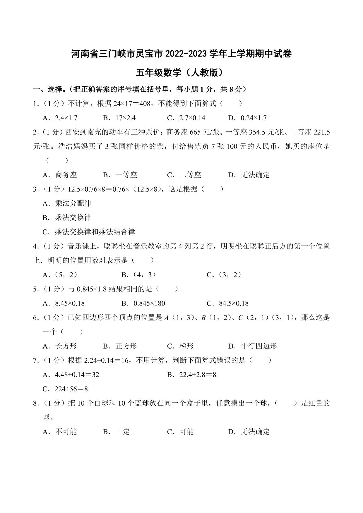河南省三门峡市灵宝市2022-2023学年上学期期中试卷五年级数学(人教版)