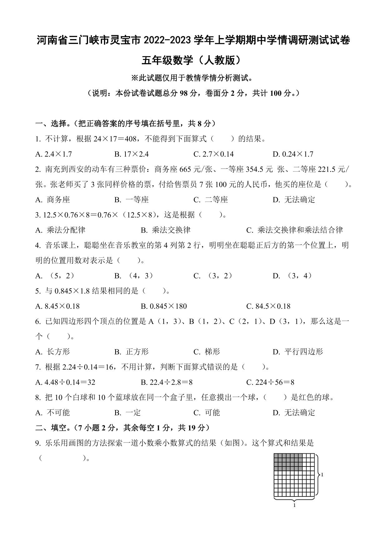 河南省三门峡市灵宝市2022-2023学年上学期期中学情调研测试试卷五年级数学(人教版)