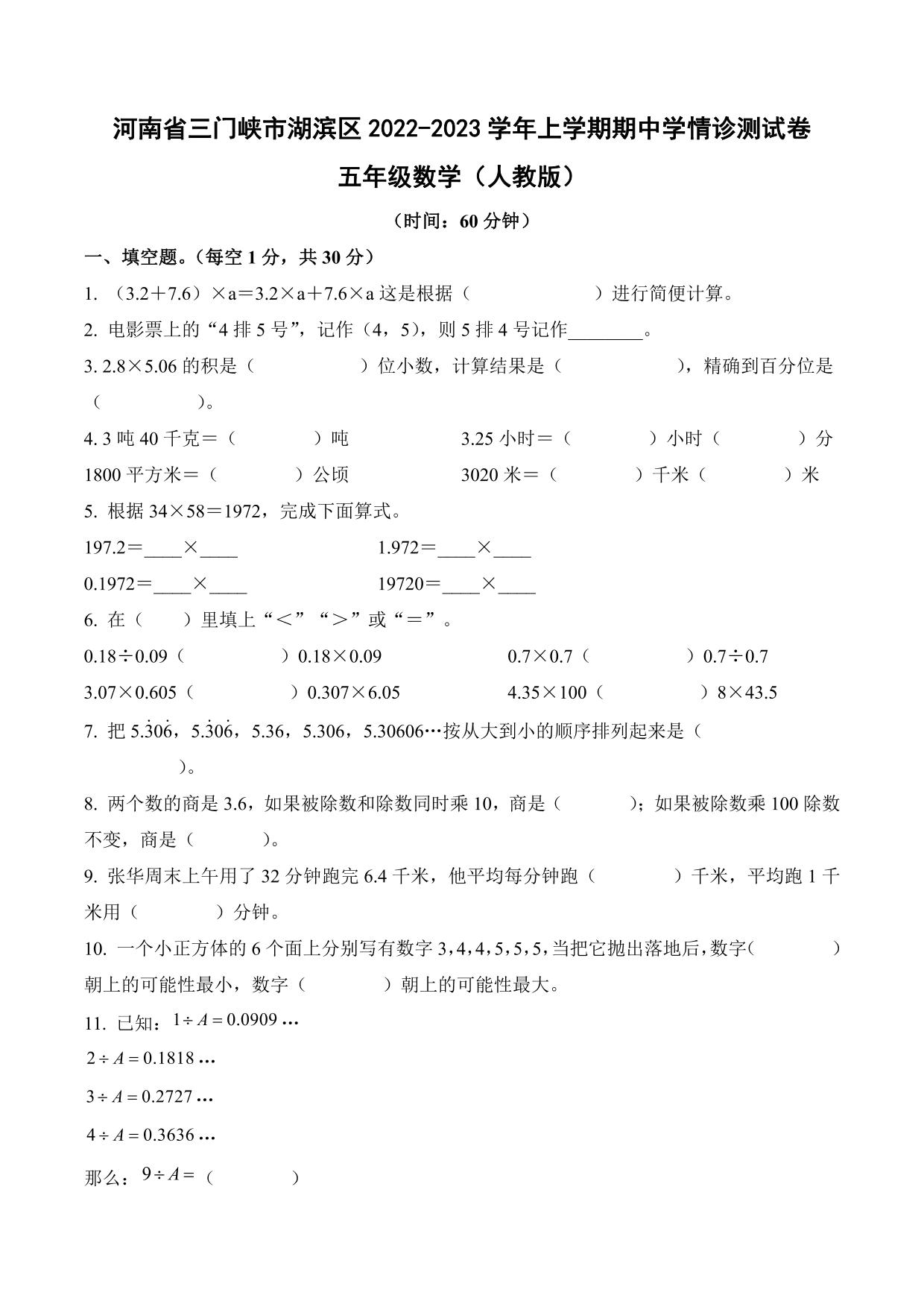 河南省三门峡市湖滨区2022-2023学年上学期期中学情诊测试卷五年级数学(人教版)