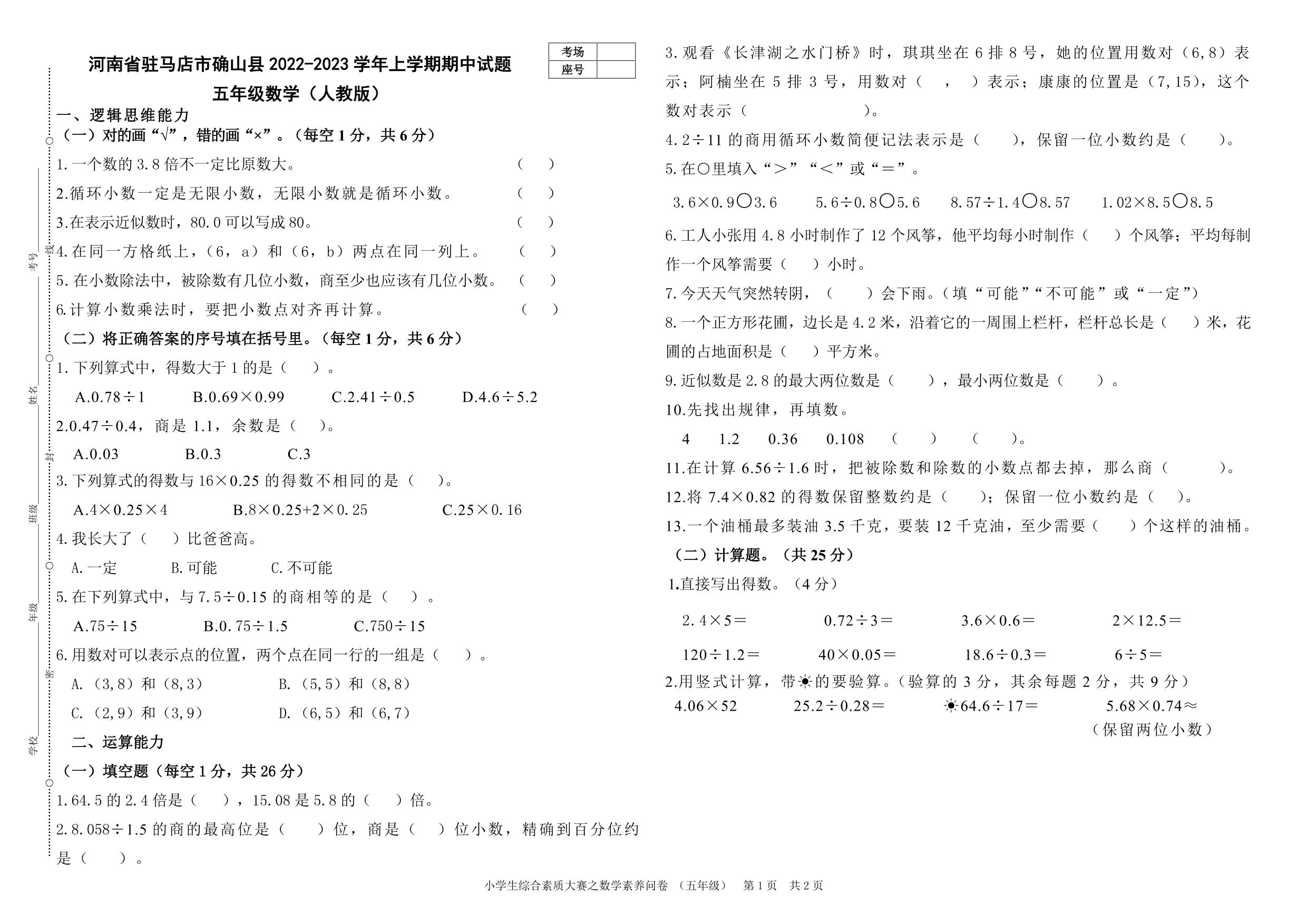 河南省驻马店市确山县2022-2023学年上学期期中试题五年级数学(人教版)
