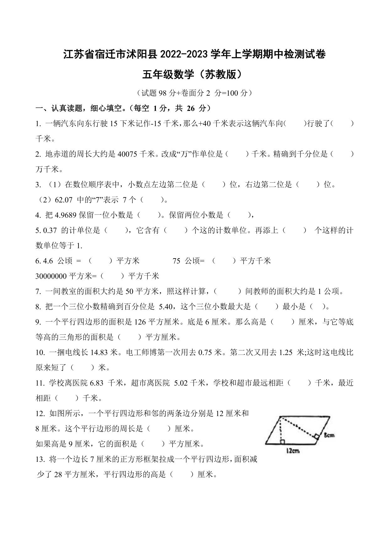 江苏省宿迁市沭阳县2022-2023学年上学期期中检测试卷五年级数学(苏教版)
