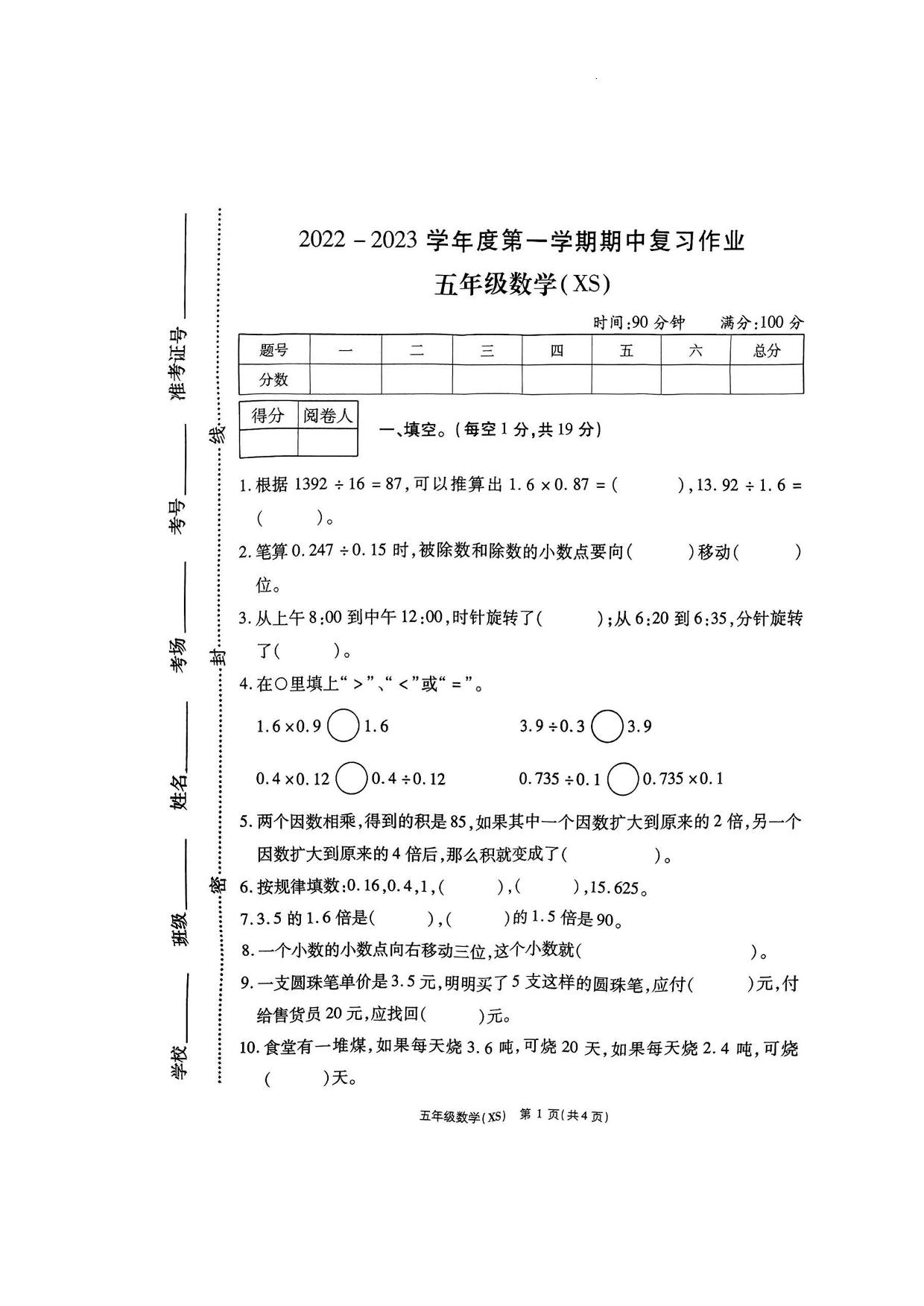 河南省周口市沈丘县某校2022-2023学年上学期期中试题五年级数学(西师版)