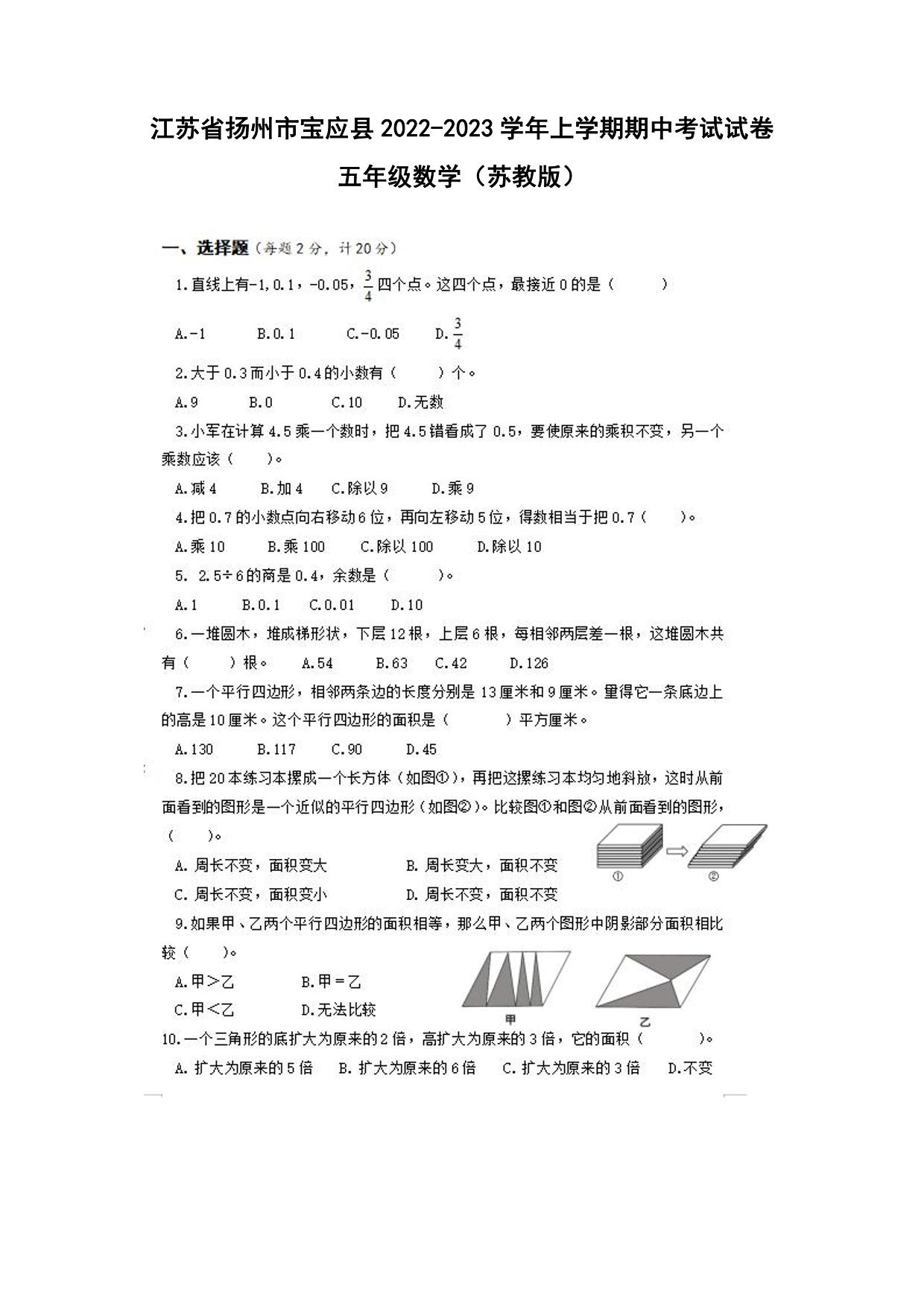 江苏省扬州市宝应县2022-2023学年上学期期中考试试卷五年级数学(苏教版)