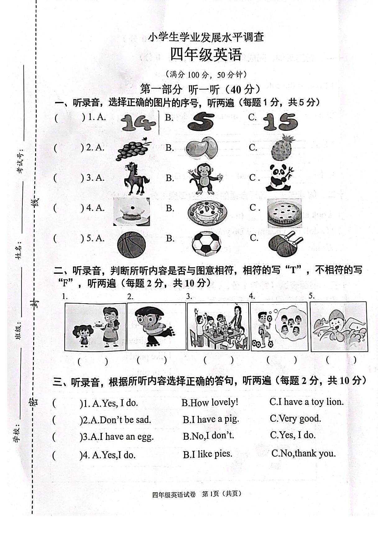 四年级英语译林版(三起始)上册期中卷