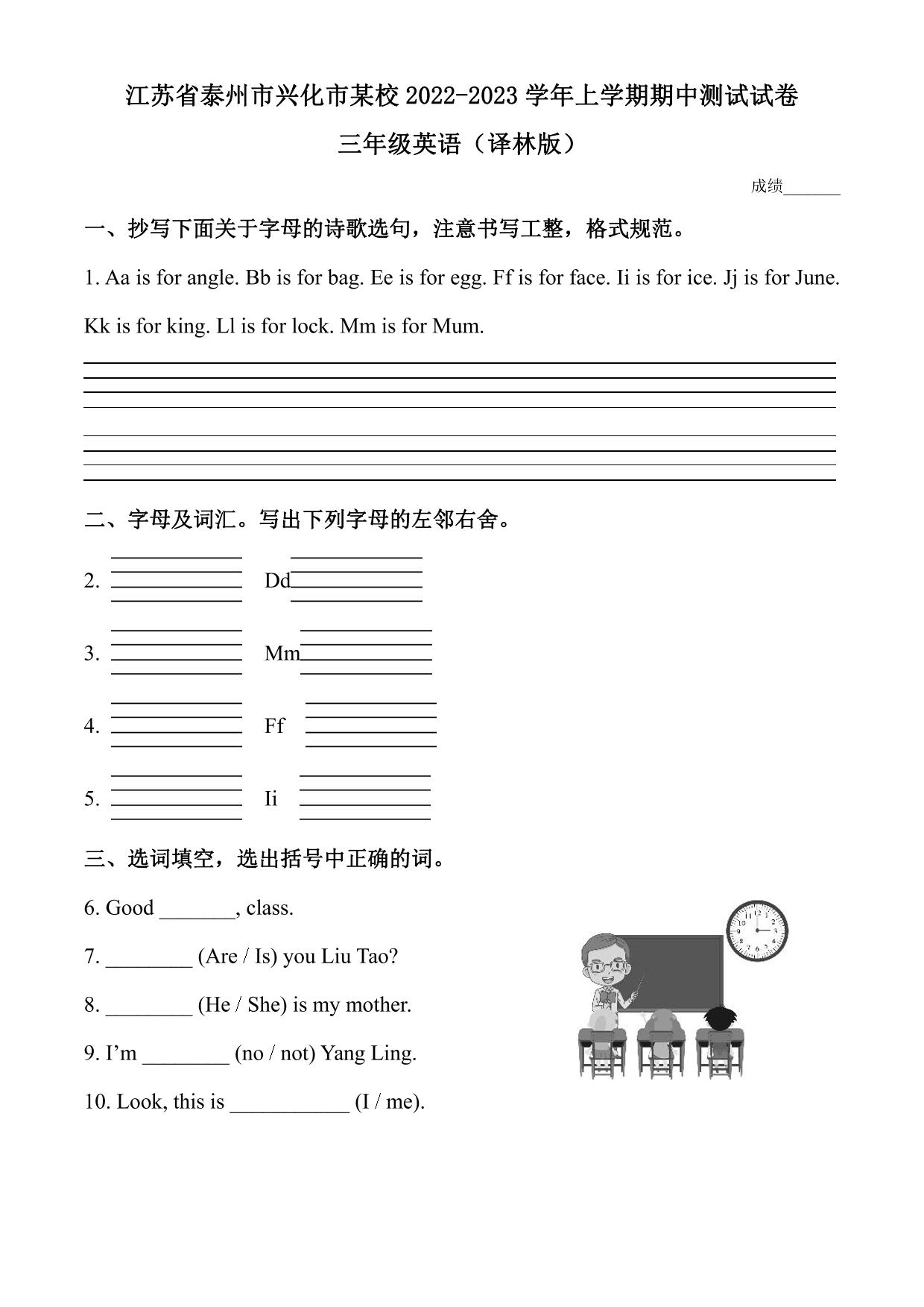 江苏省泰州市兴化市某校2022-2023学年上学期期中测试试卷三年级英语(译林版)【无听力音频】