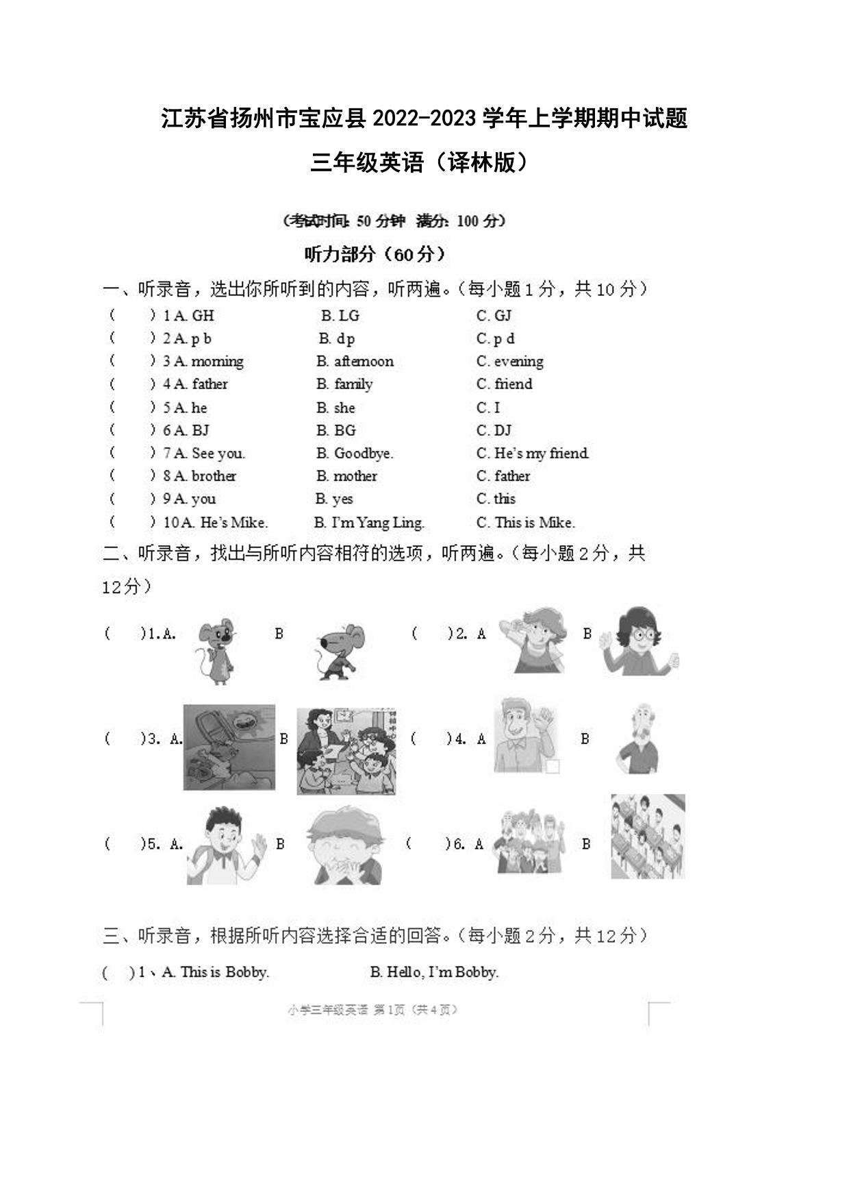 江苏省扬州市宝应县2022-2023学年上学期期中试题三年级英语(译林版)【无听力音频】