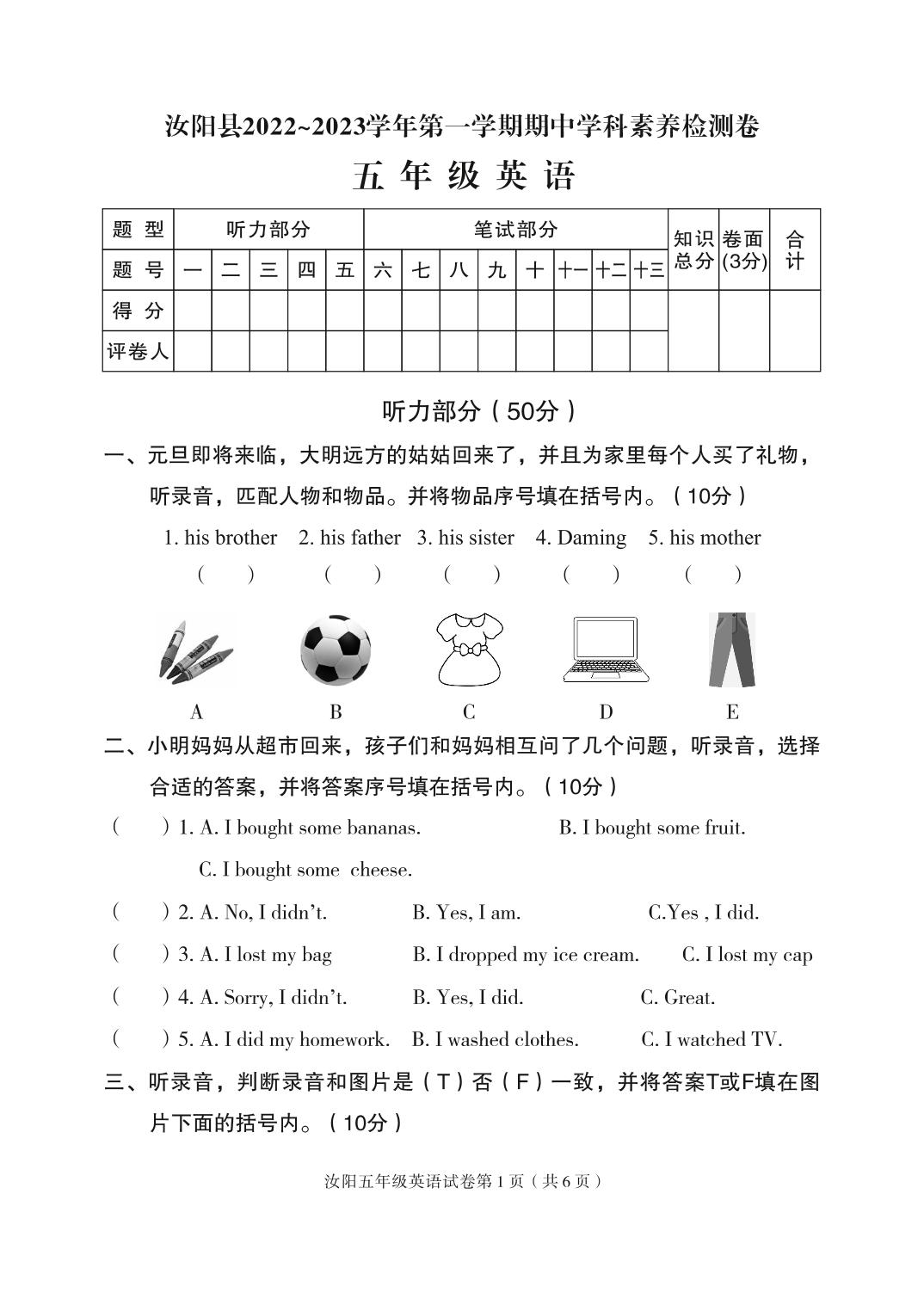 河南省洛阳市汝阳县2022-2023学年上学期期中考试试题五年级英语(外研版)【无听力音频】