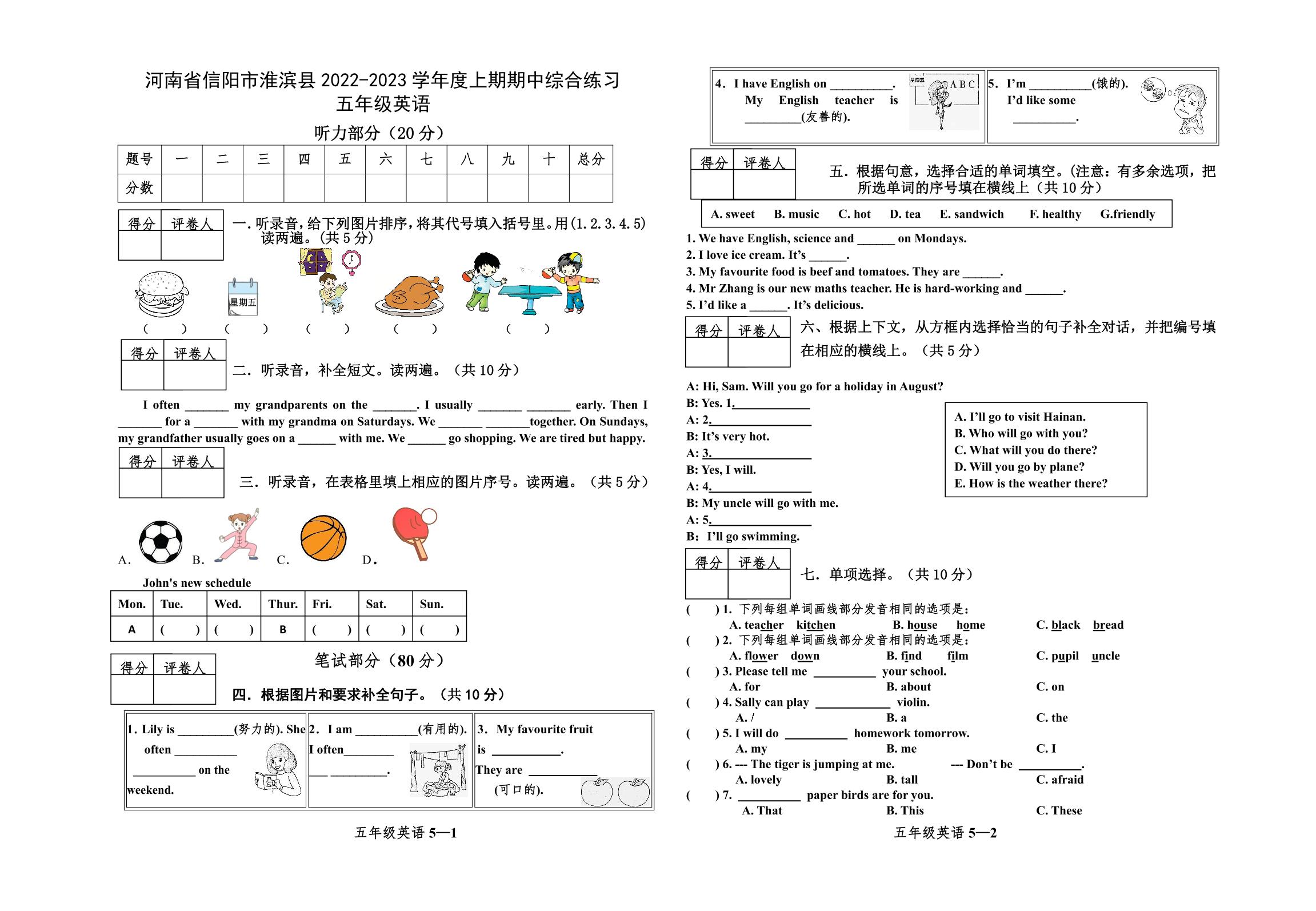 河南省信阳市淮滨县2022-2023学年度上期期中综合练习五年级英语(人教PEP版)【无听力音频】