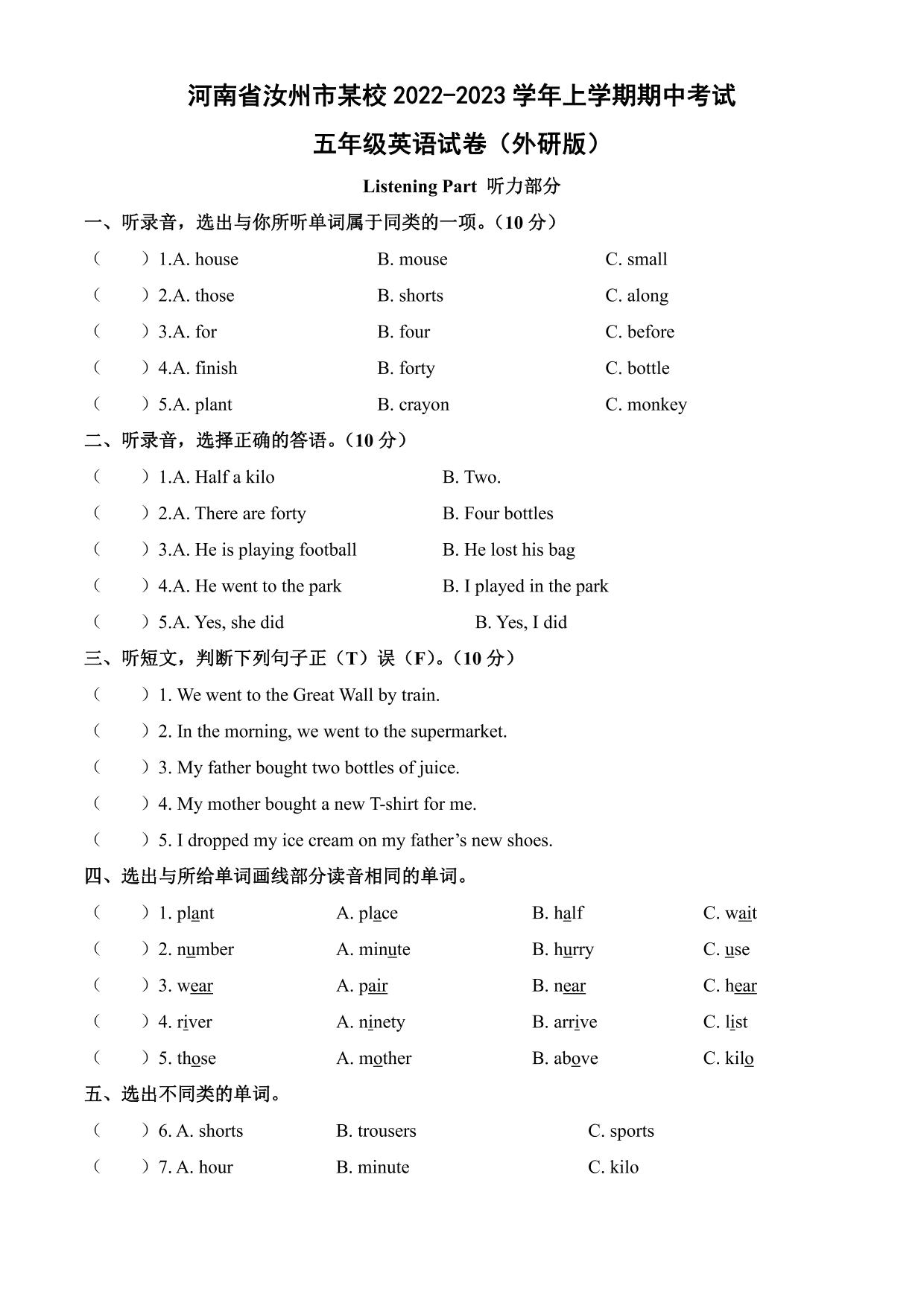 河南省汝州市某校2022-2023学年上学期期中考试五年级英语试卷(外研版)【无听力音频】