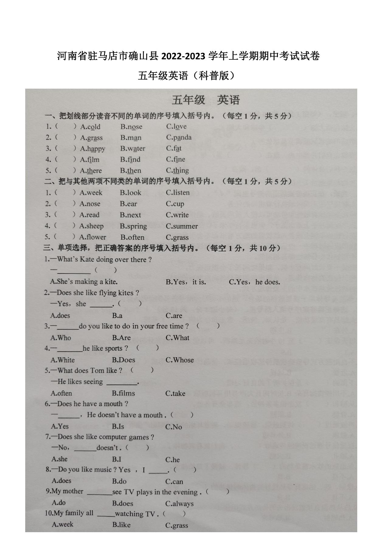 河南省驻马店市确山县2022-2023学年上学期期中考试试卷五年级英语(外研版)【无听力音频】