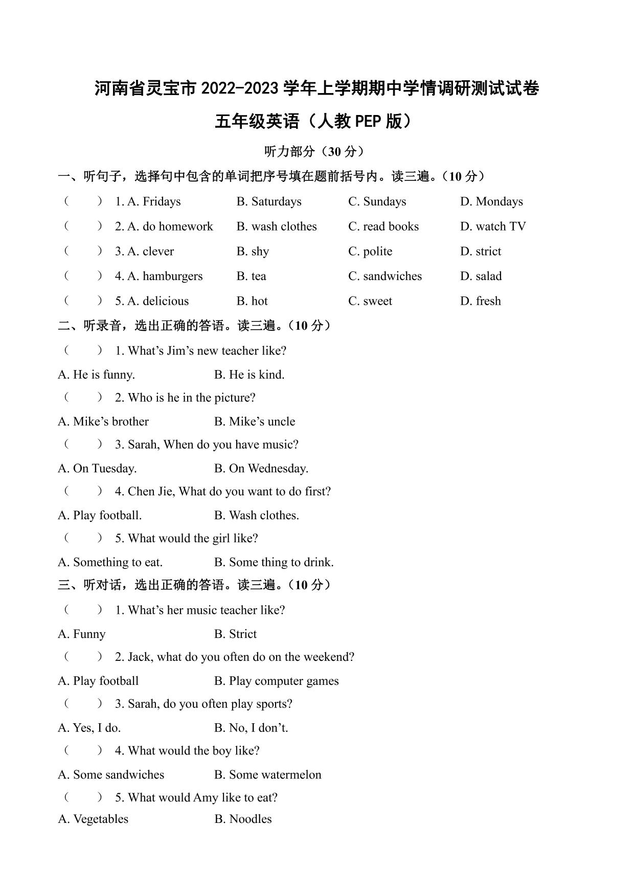 河南省灵宝市2022-2023学年上学期期中学情调研测试试卷五年级英语(人教PEP版)【无听力音频】