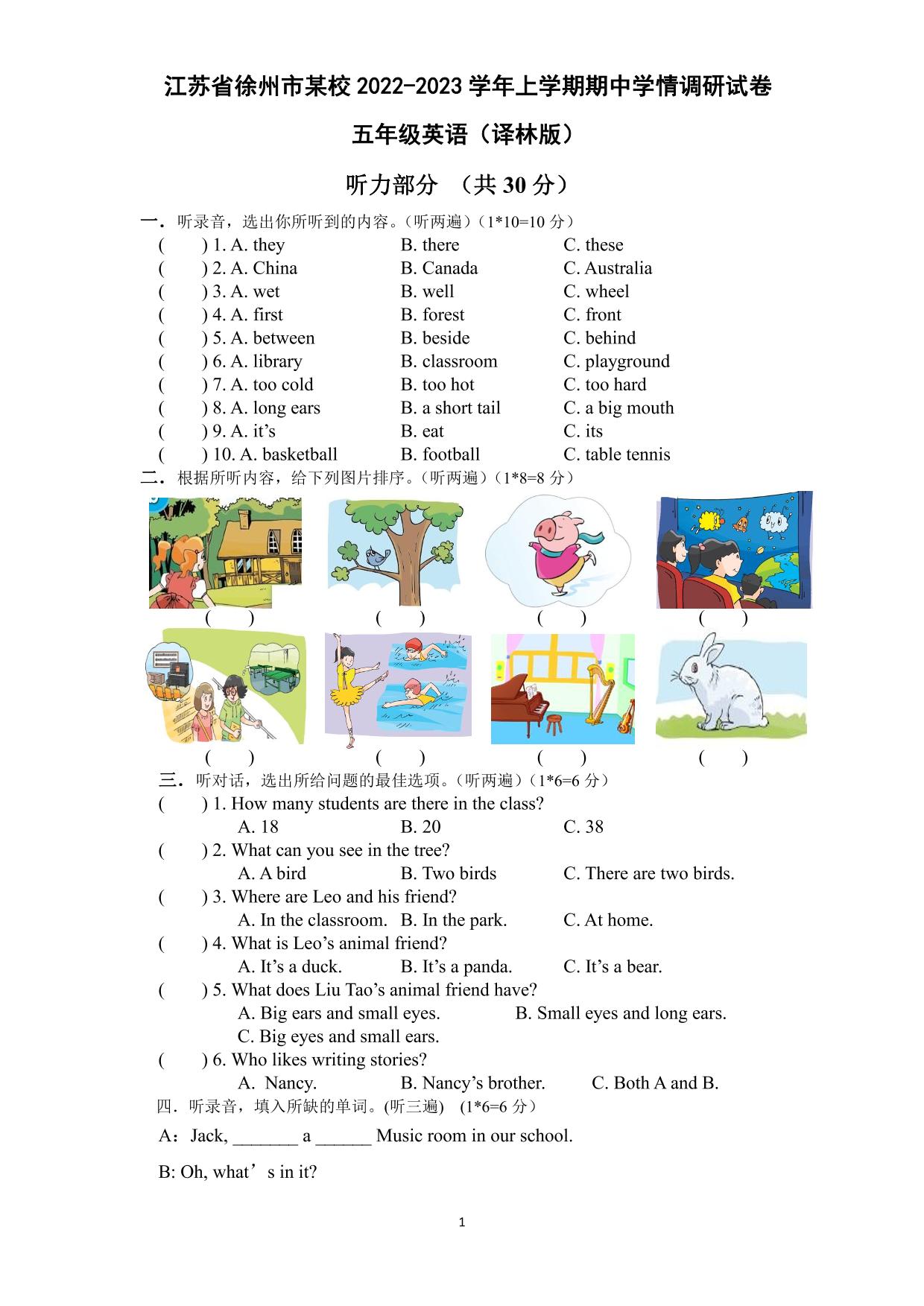江苏省徐州市某校2022-2023学年上学期期中学情调研试卷五年级英语(译林版)【无听力音频】