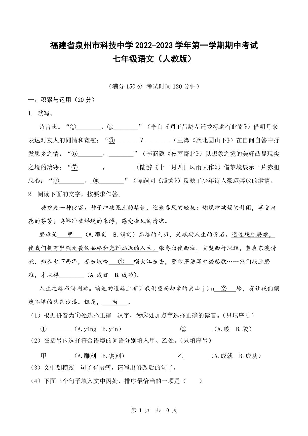 福建省泉州科技中学2022-2023学年第一学期期中考试七年级语文(人教版)