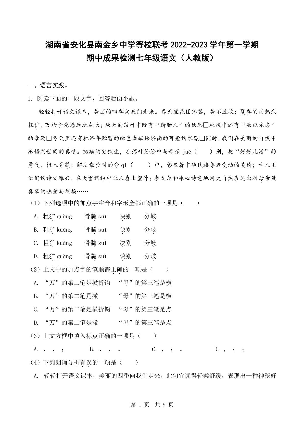 湖南省安化县南金乡中学等校联考2022-2023学年第一学期期中成果检测七年级语文(人教版)