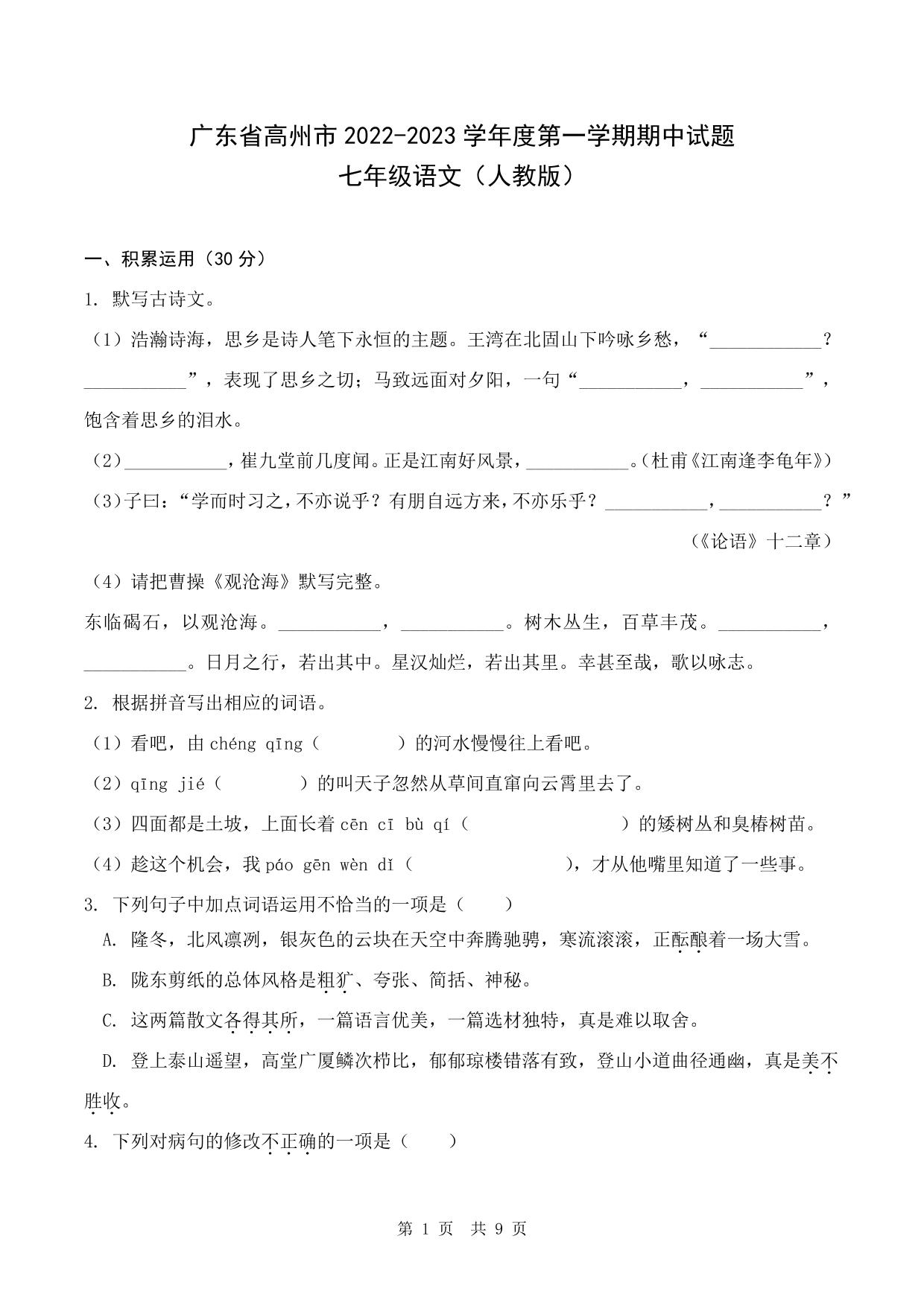 广东省高州市部分学校2022-2023学年度第一学期期中试题七年级语文(人教版)