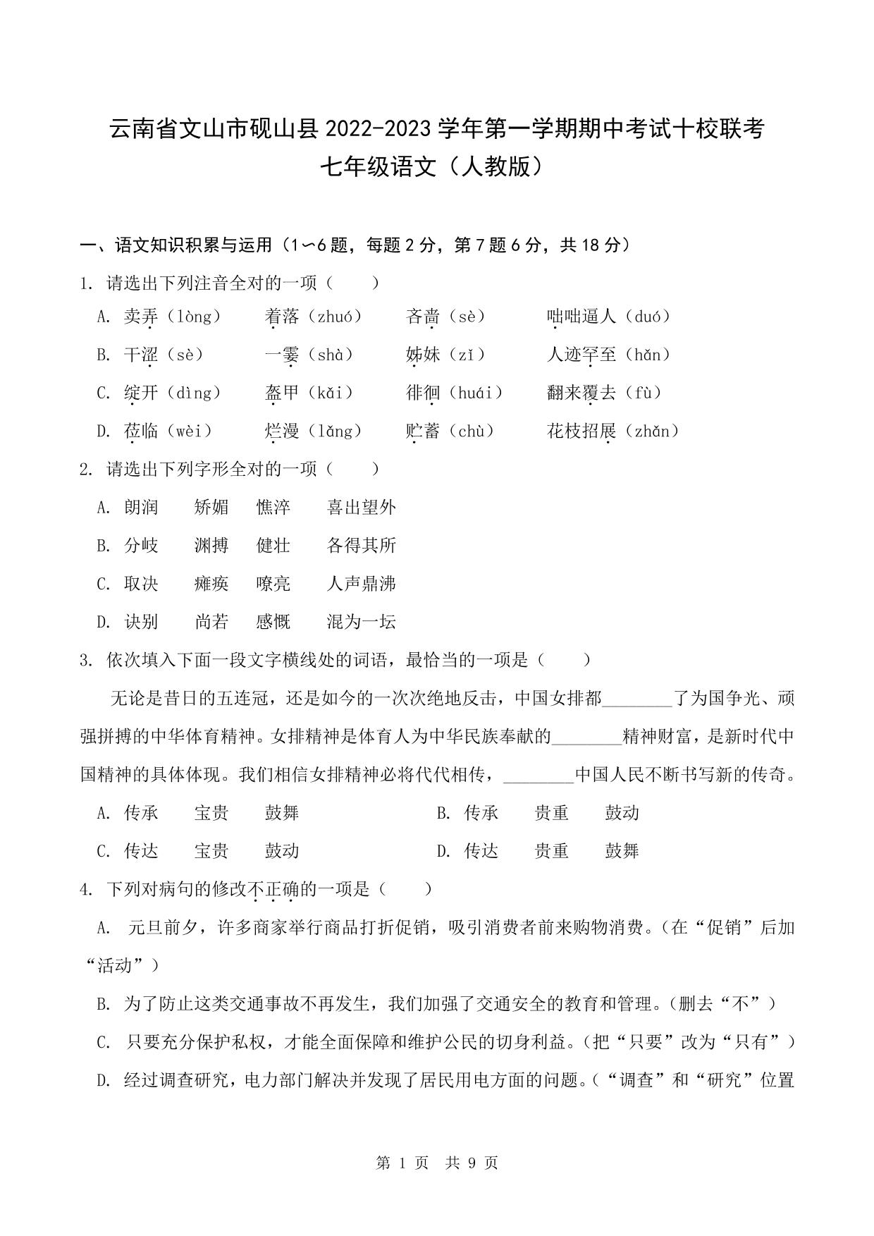云南省文山市砚山县2022-2023学年第一学期期中考试十校联考七年级语文(人教版)