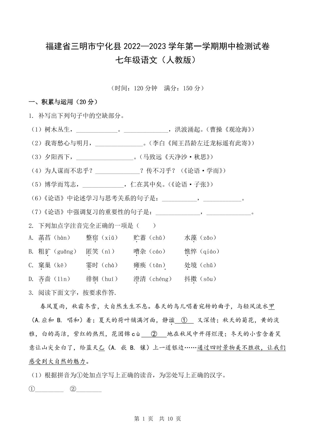 福建省三明市宁化县2022-2023学年第一学期期中检测试卷七年级语文(人教版)
