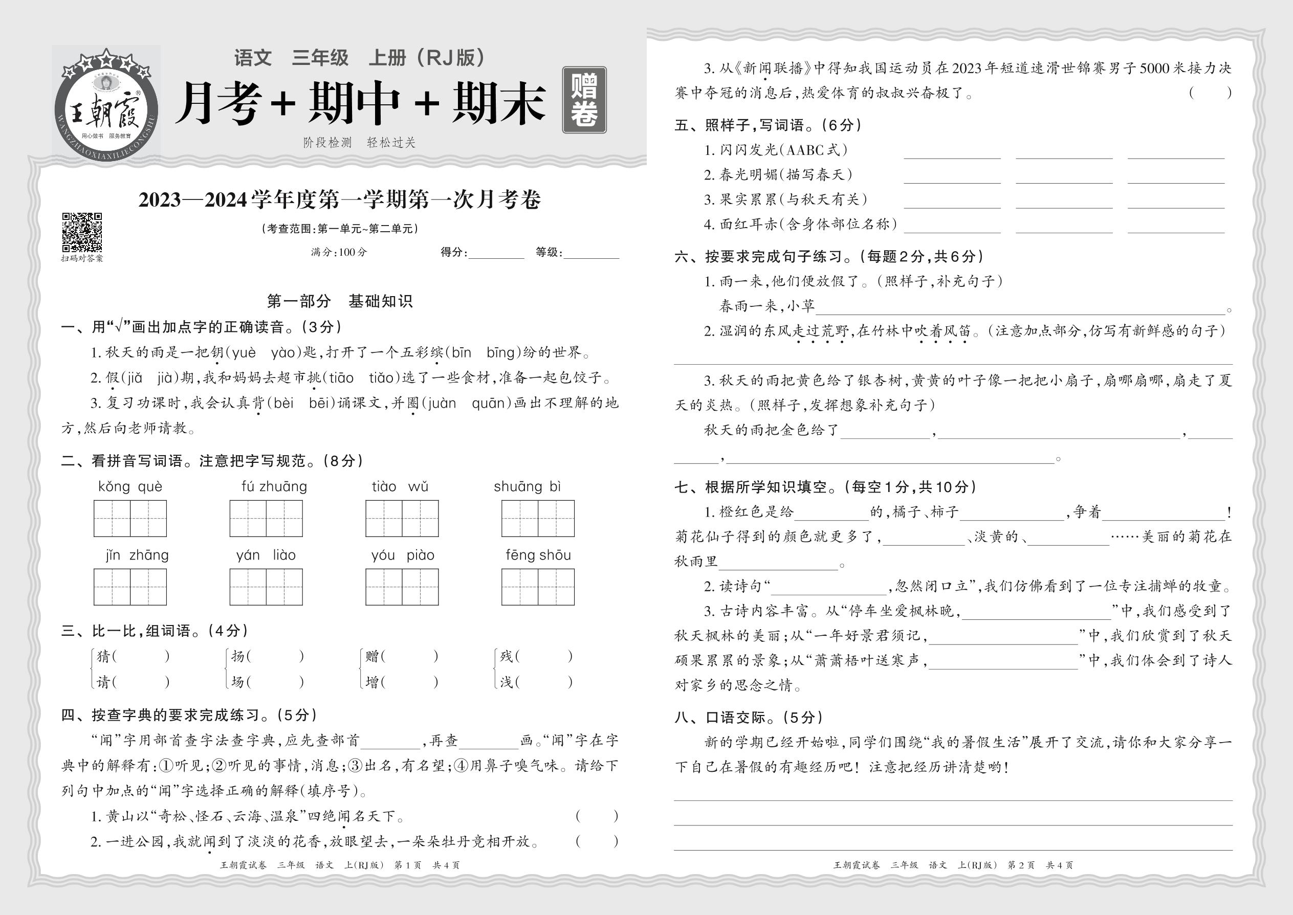 三年级语文人教版上册月考卷