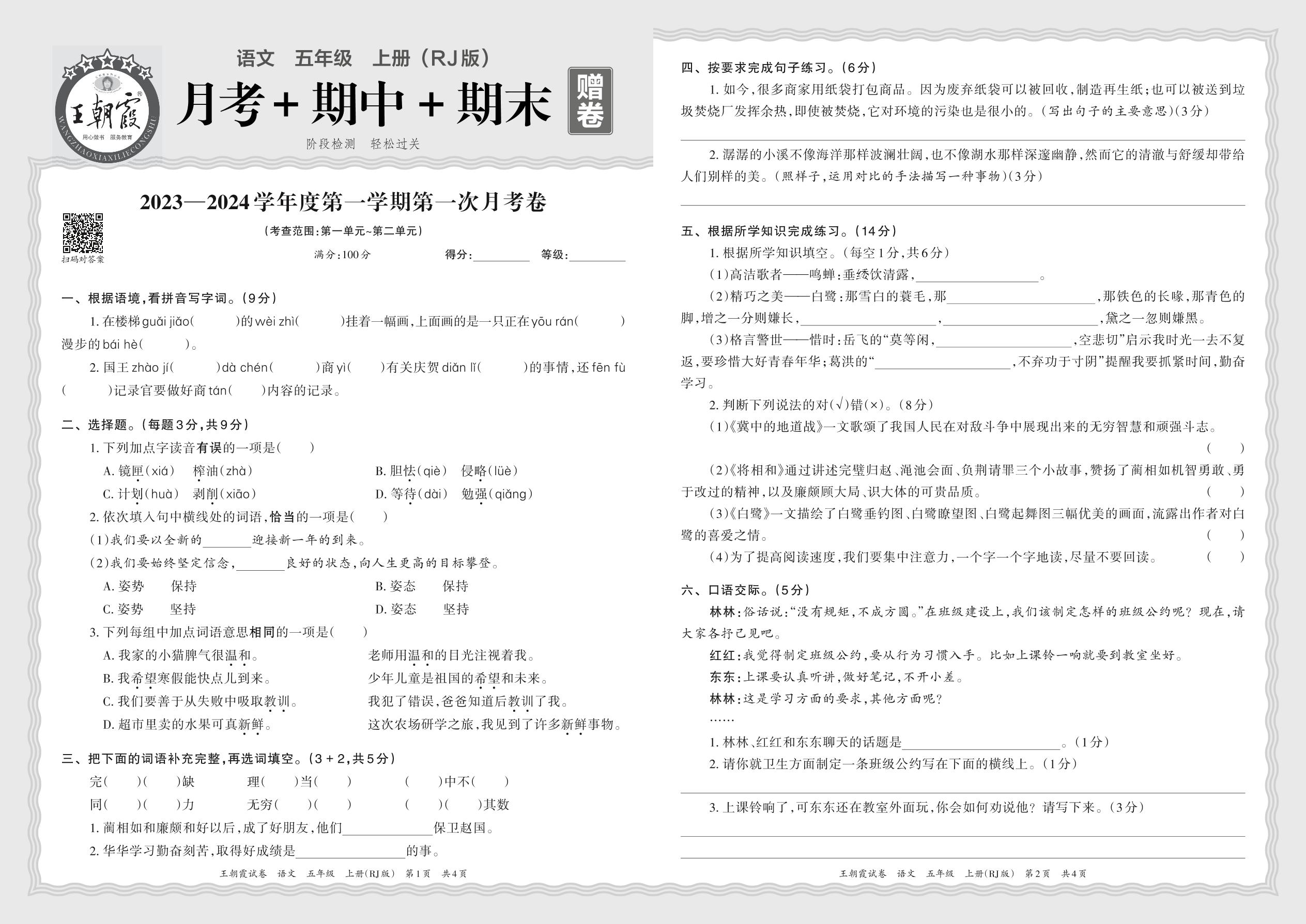 2023—2024学年度第一学期第一次月考卷五年级语文(人教版)
