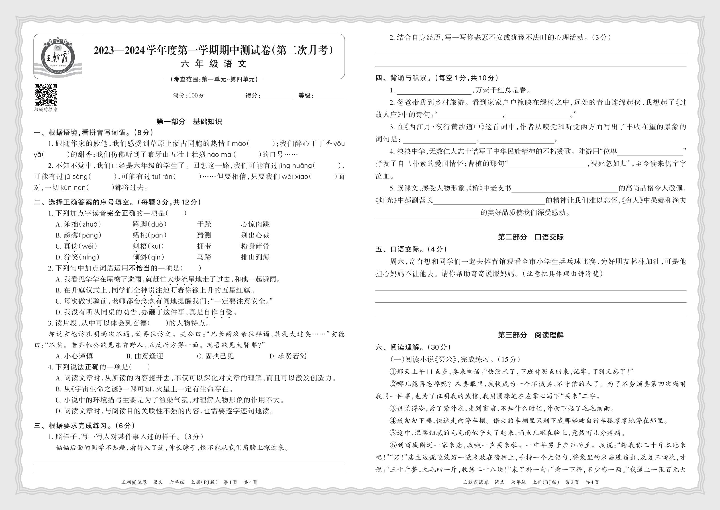 2023—2024学年度第一学期期中测试卷(第二次月考)六年级语文(人教版)