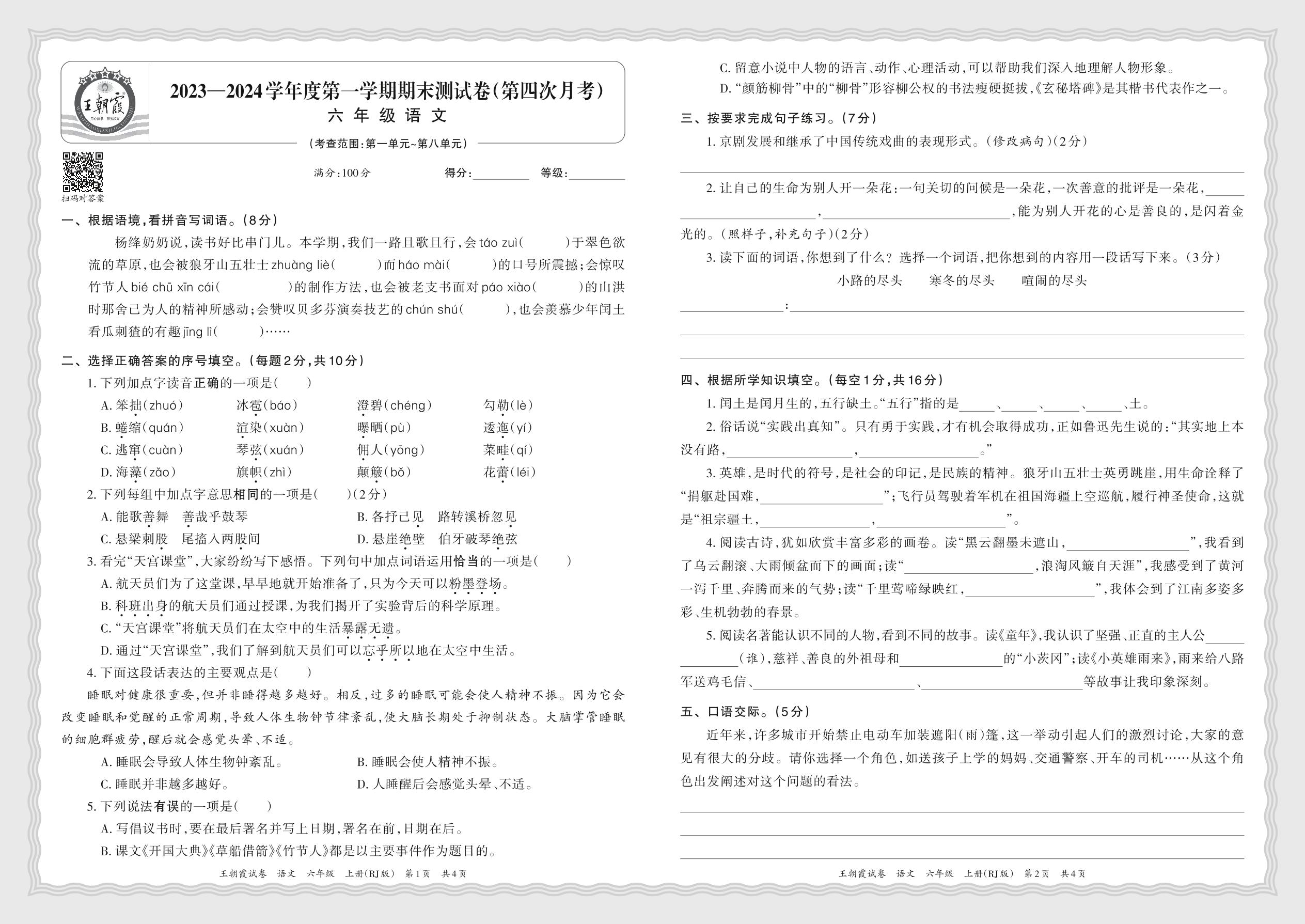 2023—2024学年度第一学期期末测试卷(第四次月考)六年级语文(人教版)