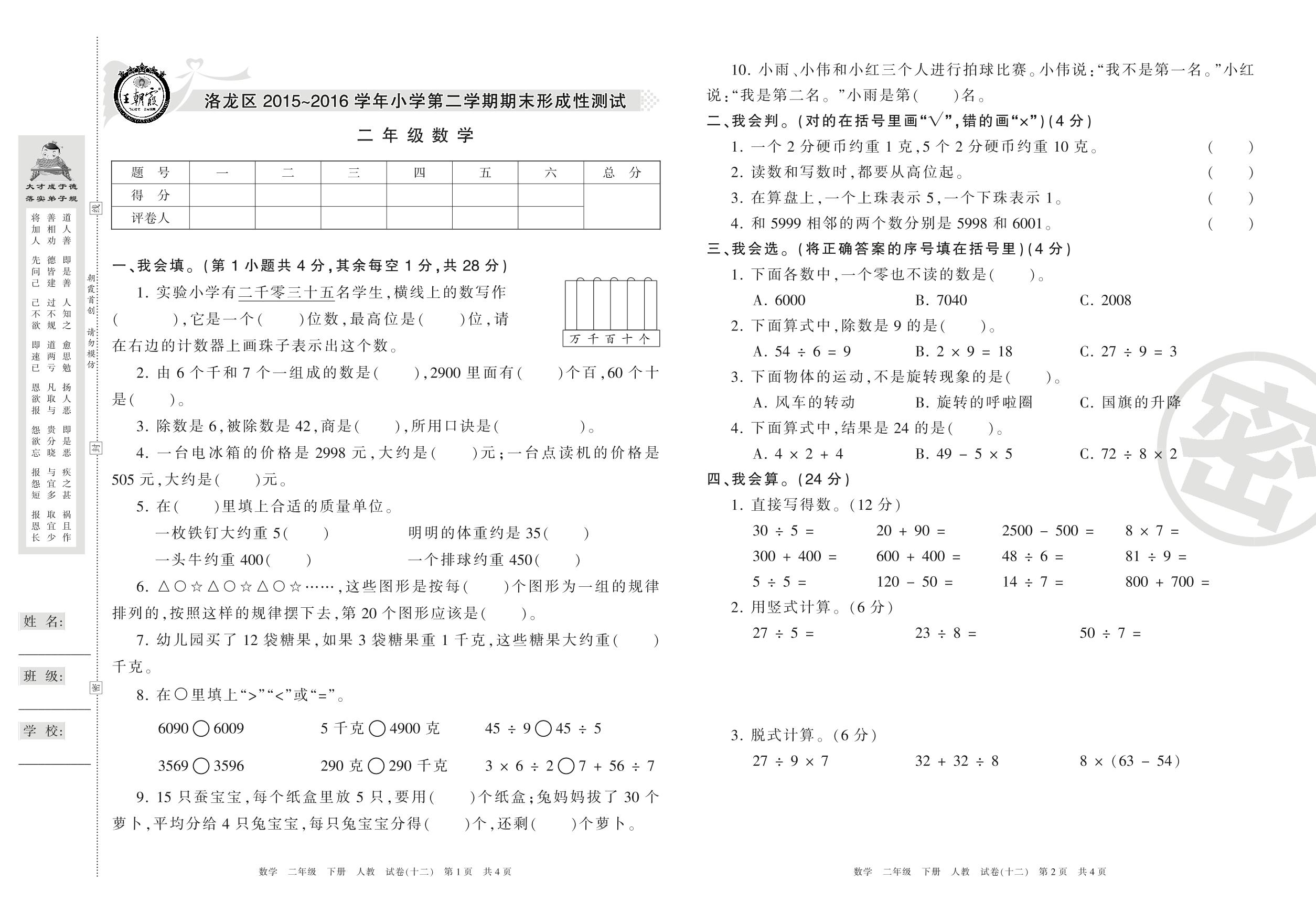 2015-2016学年第二学期洛阳市洛龙区二年级数学试卷(人教版)【12】