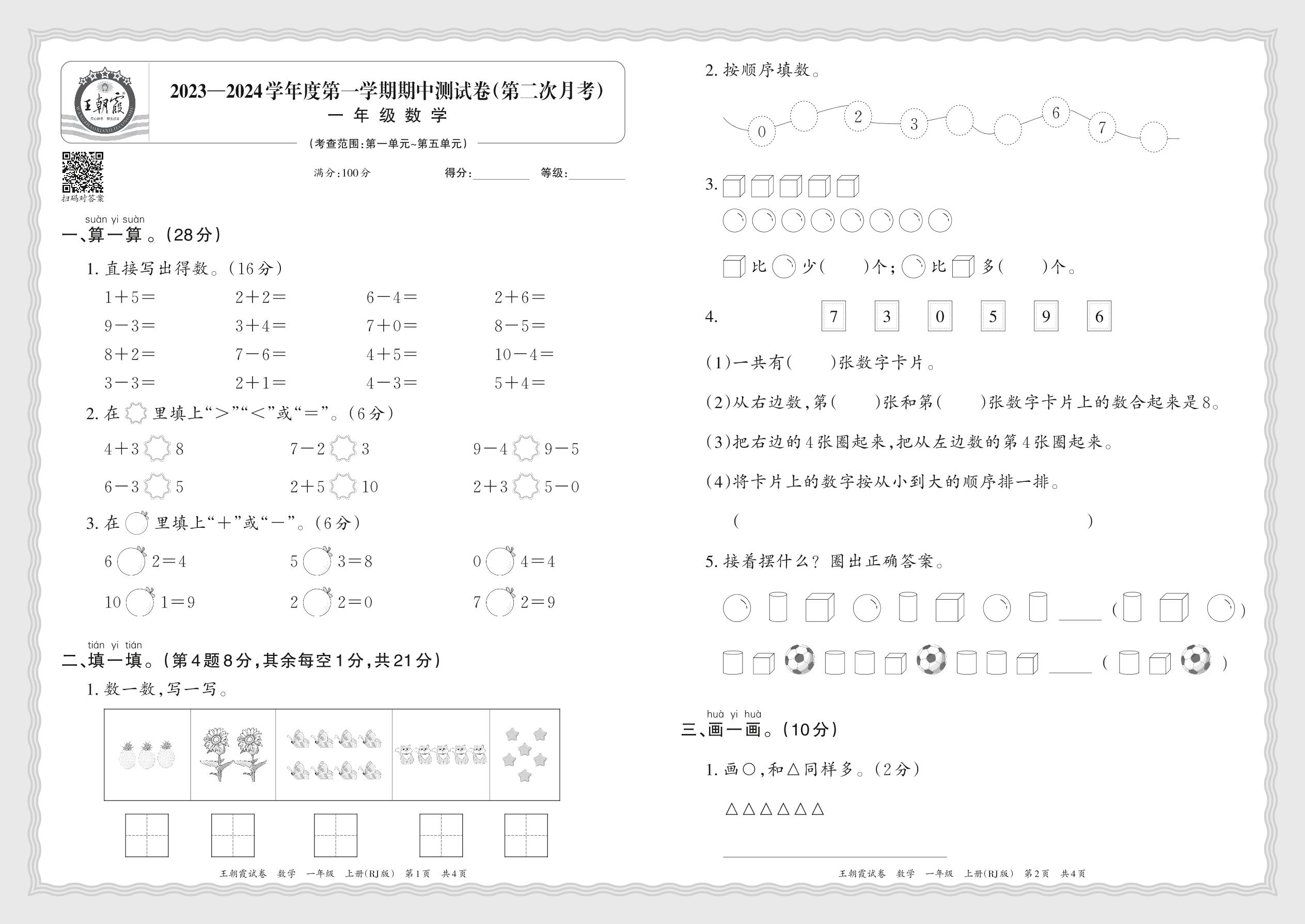 2023—2024学年度第一学期期中测试卷(第二次月考)一年级数学(人教版)