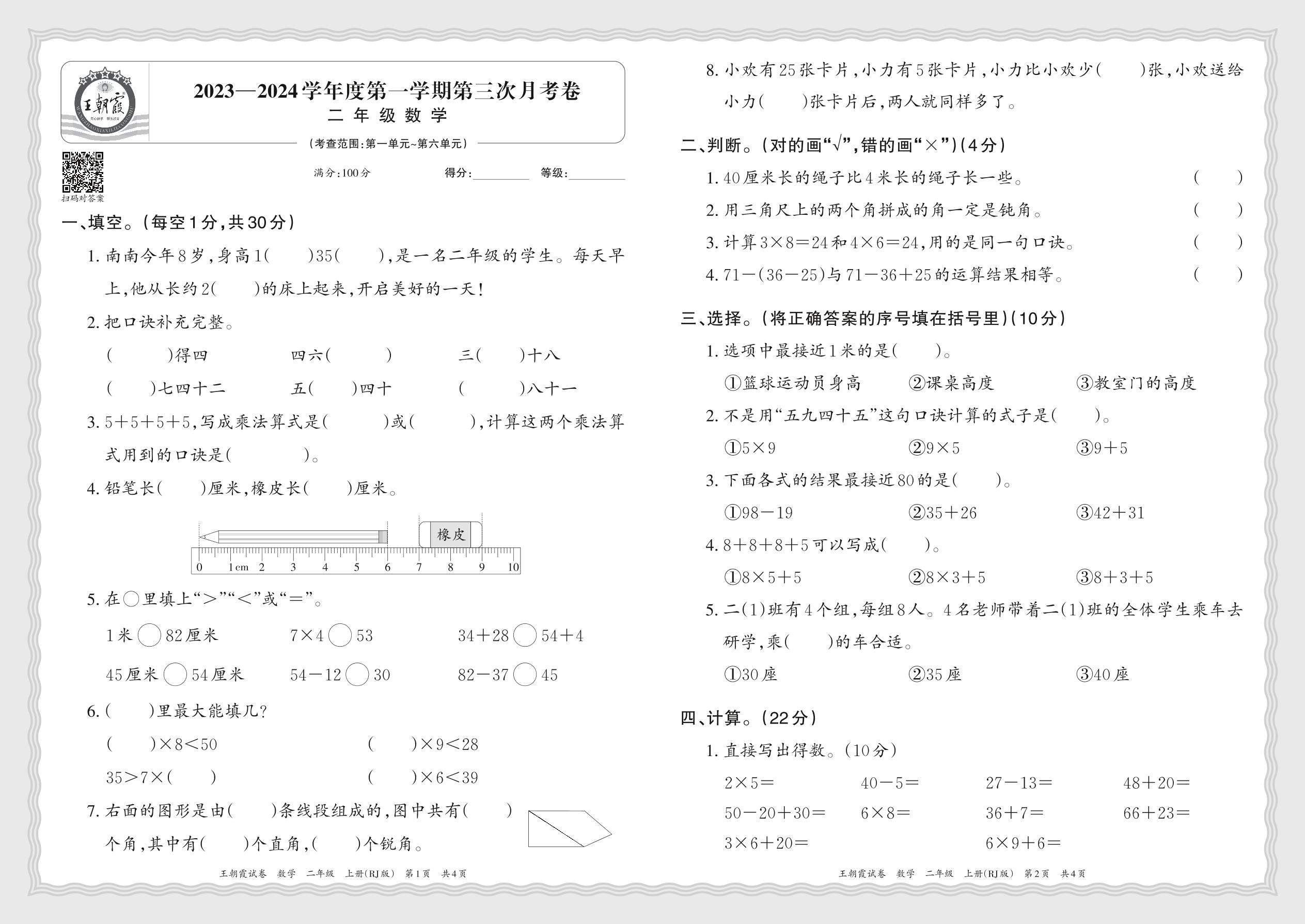 2023—2024学年度第一学期第三次月考卷二年级数学(人教版)