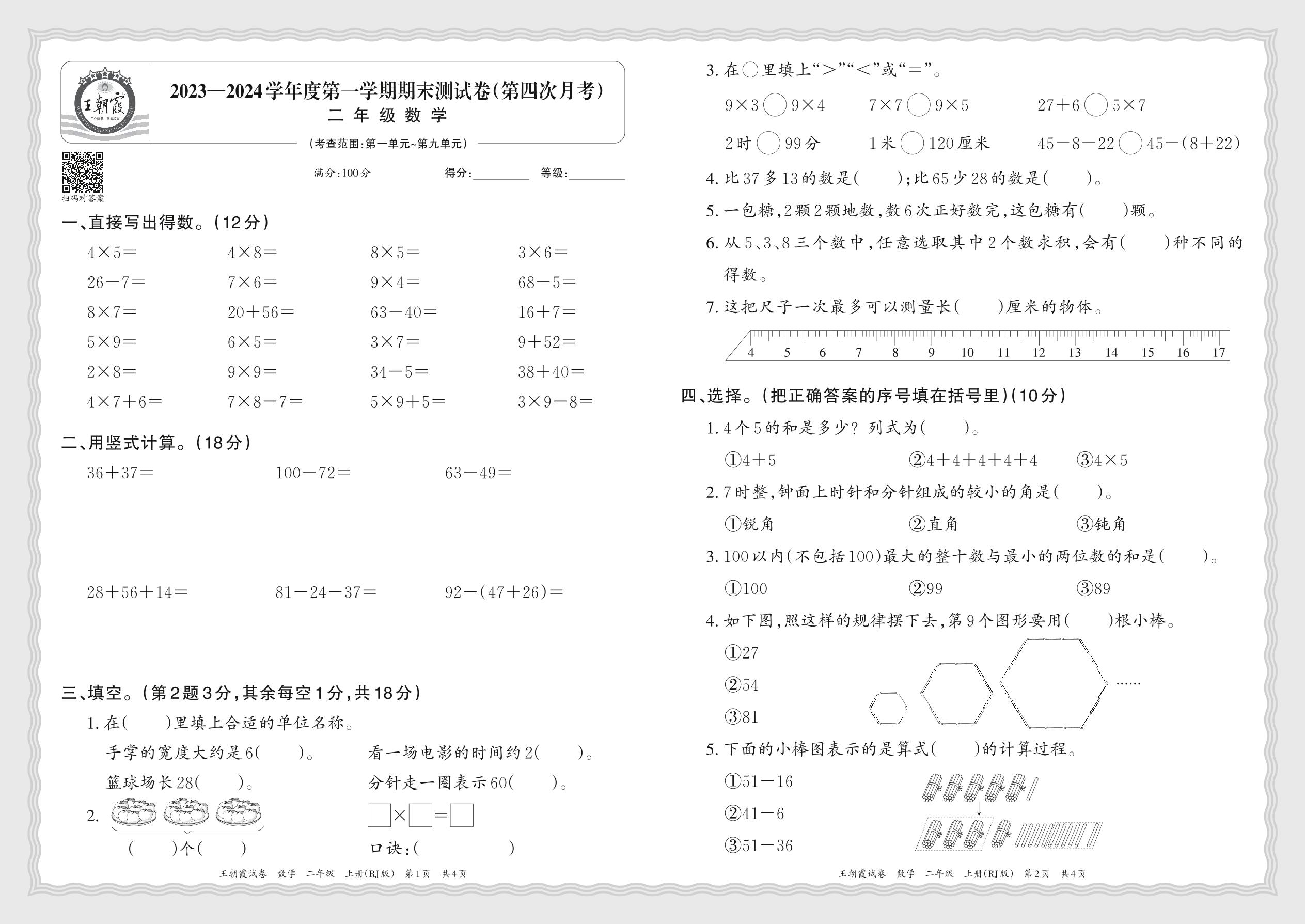 2023—2024学年度第一学期期末测试卷(第四次月考)二年级数学(人教版)