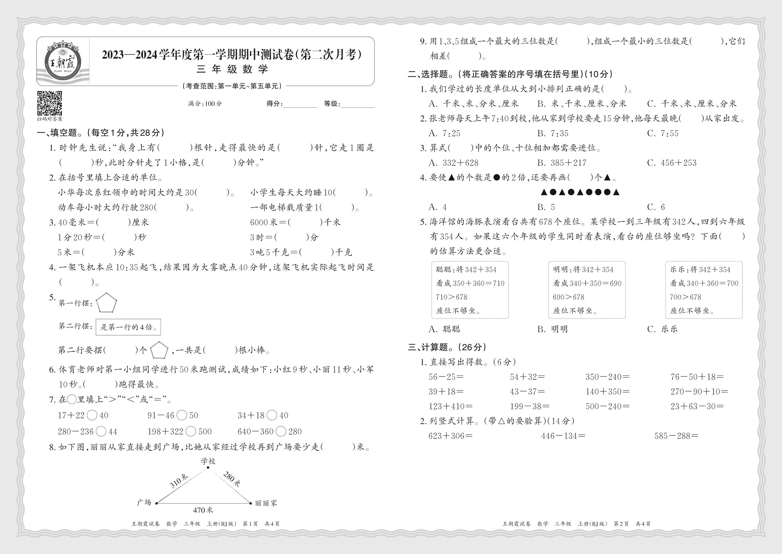 2023—2024学年度第一学期期中测试卷(第二次月考)三年级数学(人教版)