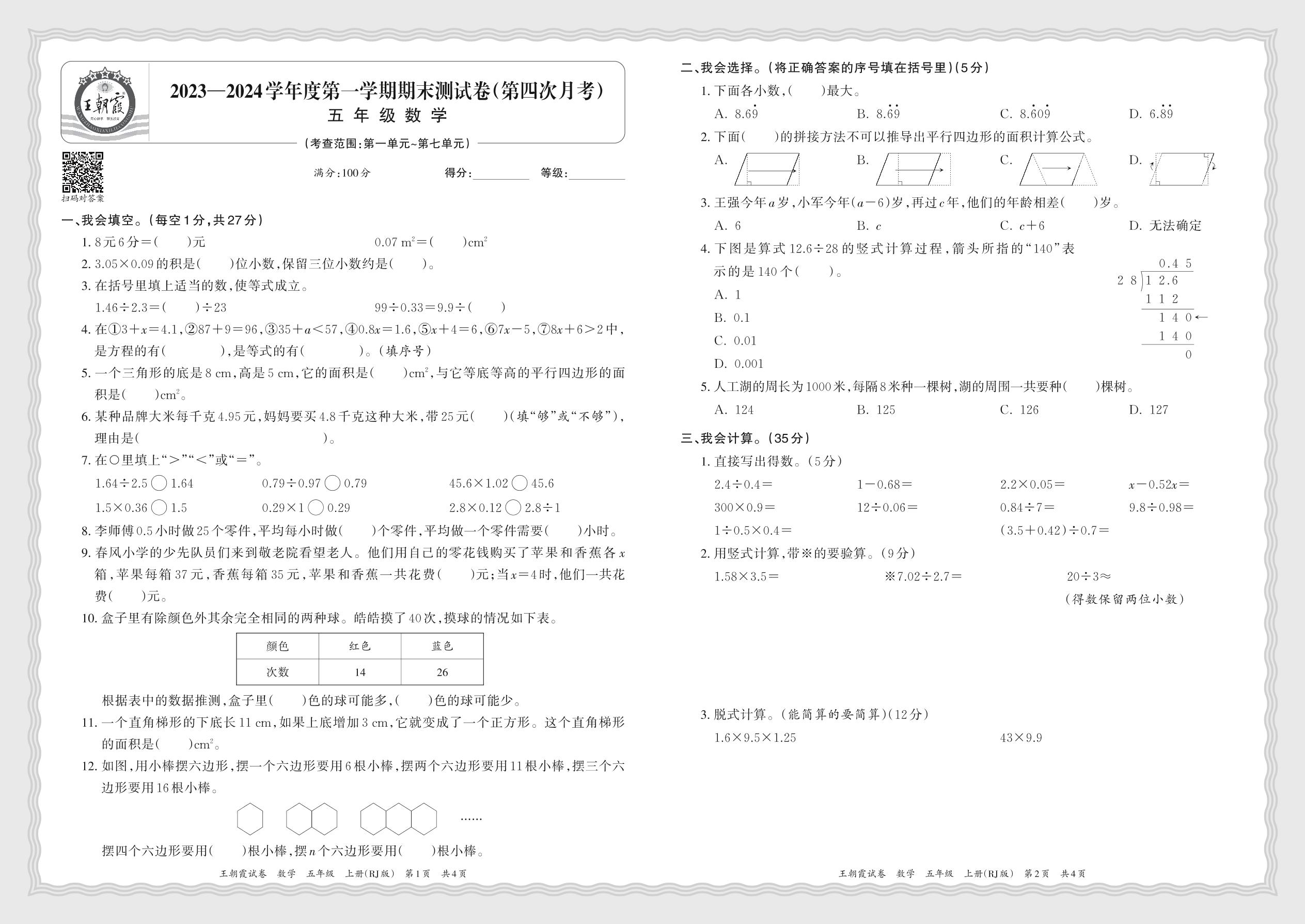 2023—2024学年度第一学期期末测试卷(第四次月考)五年级数学(人教版)