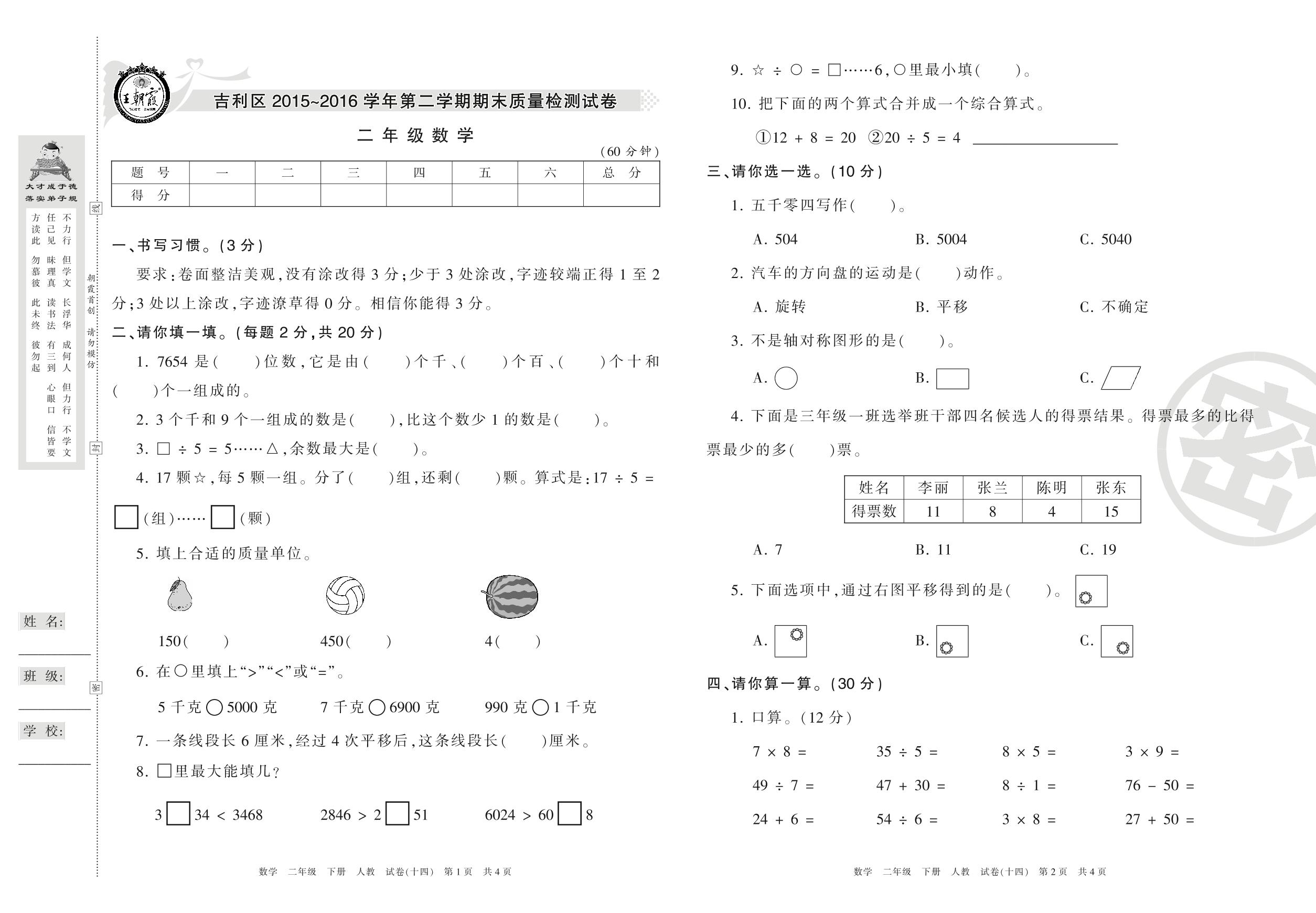 2015-2016学年第二学期洛阳市吉利区二年级数学试卷(人教版)【14】