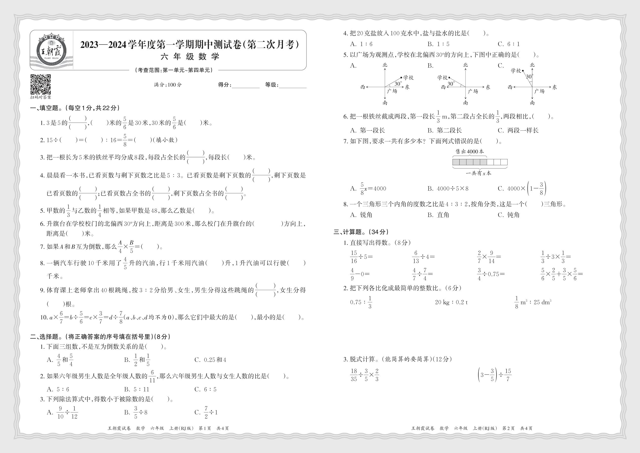2023—2024学年度第一学期期中测试卷(第二次月考)六年级数学(人教版)