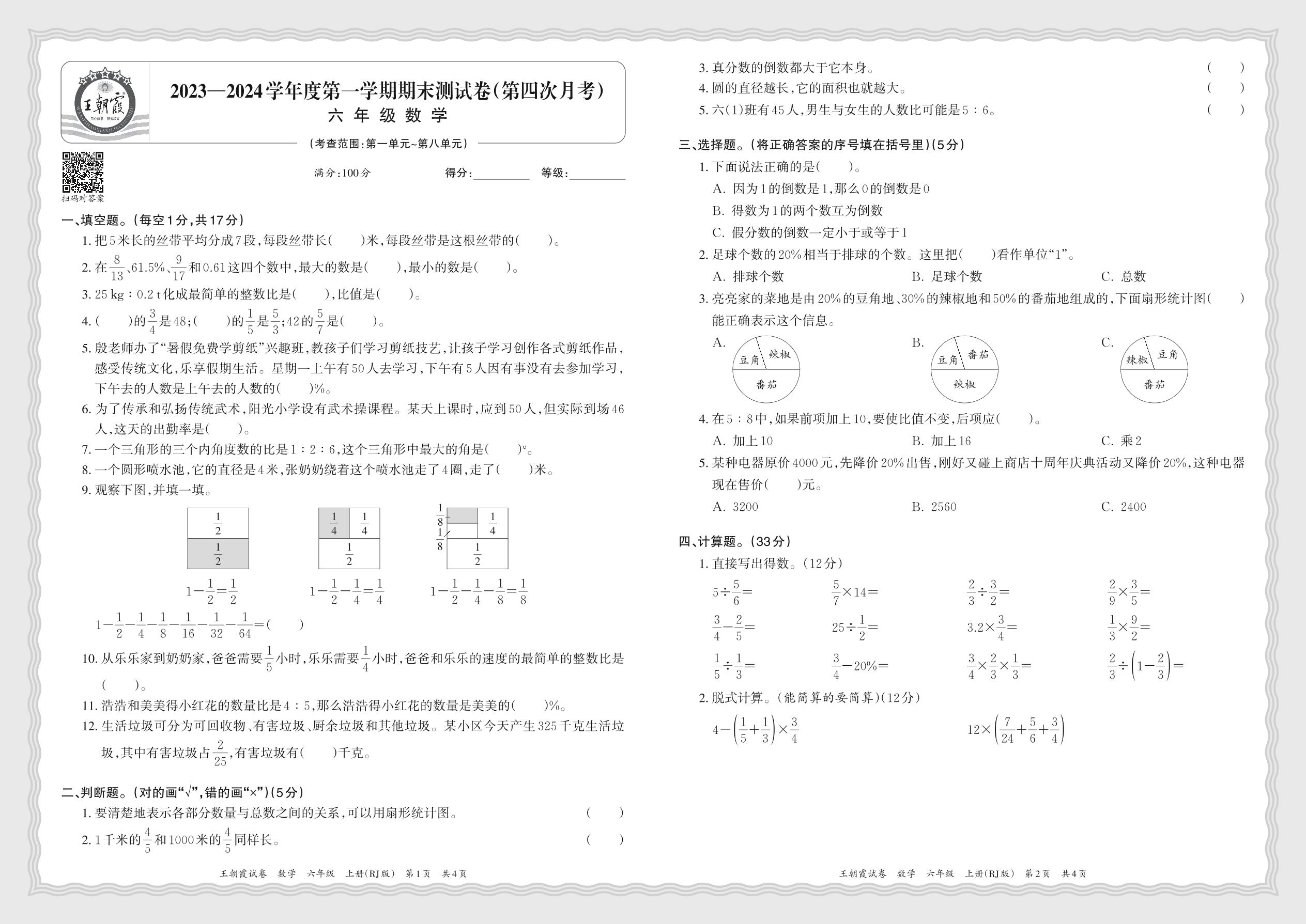 2023—2024学年度第一学期期末测试卷(第四次月考)六年级数学(人教版)