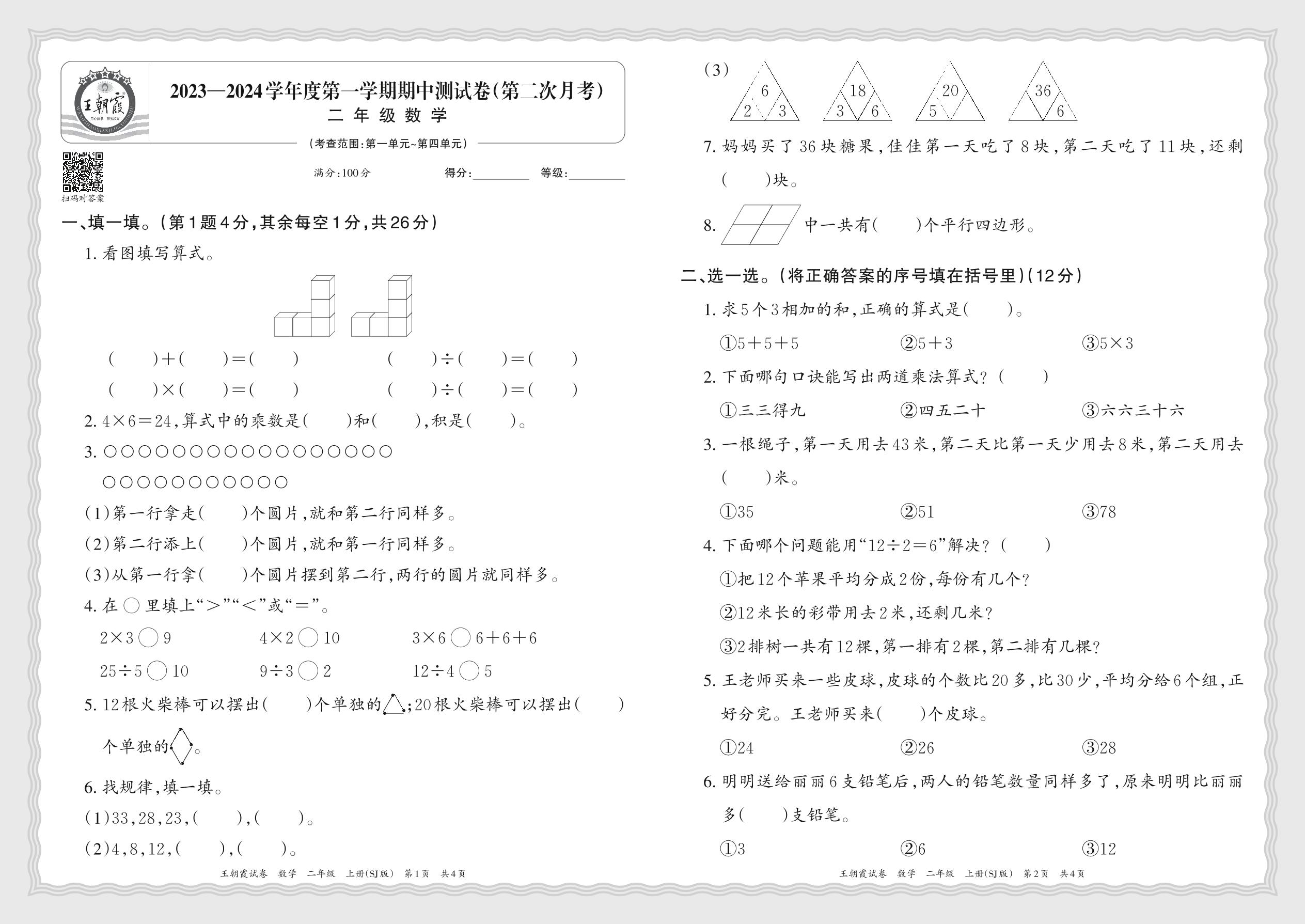 2023—2024学年度第一学期期中测试卷(第二次月考)二年级数学(苏教版)