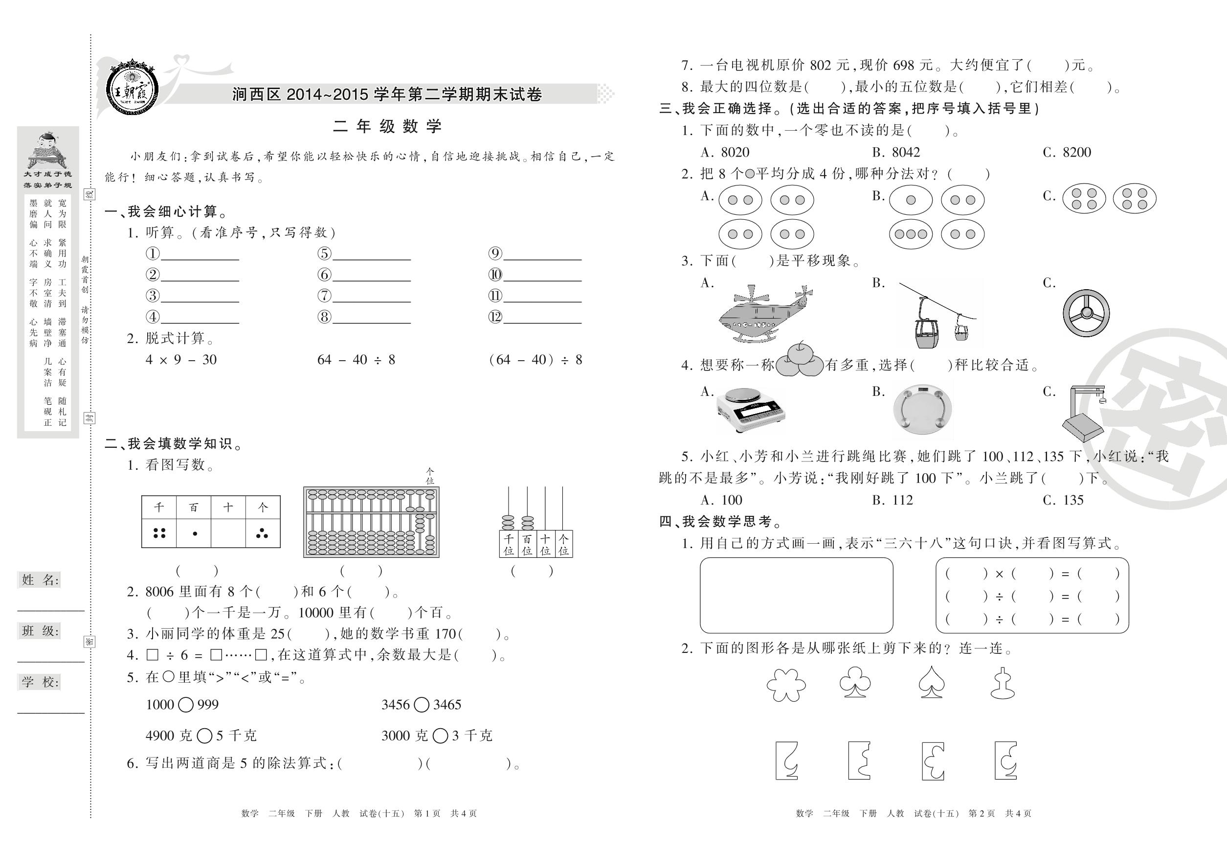 2015-2016学年第二学期洛阳市涧西区二年级数学试卷(人教版)【15】