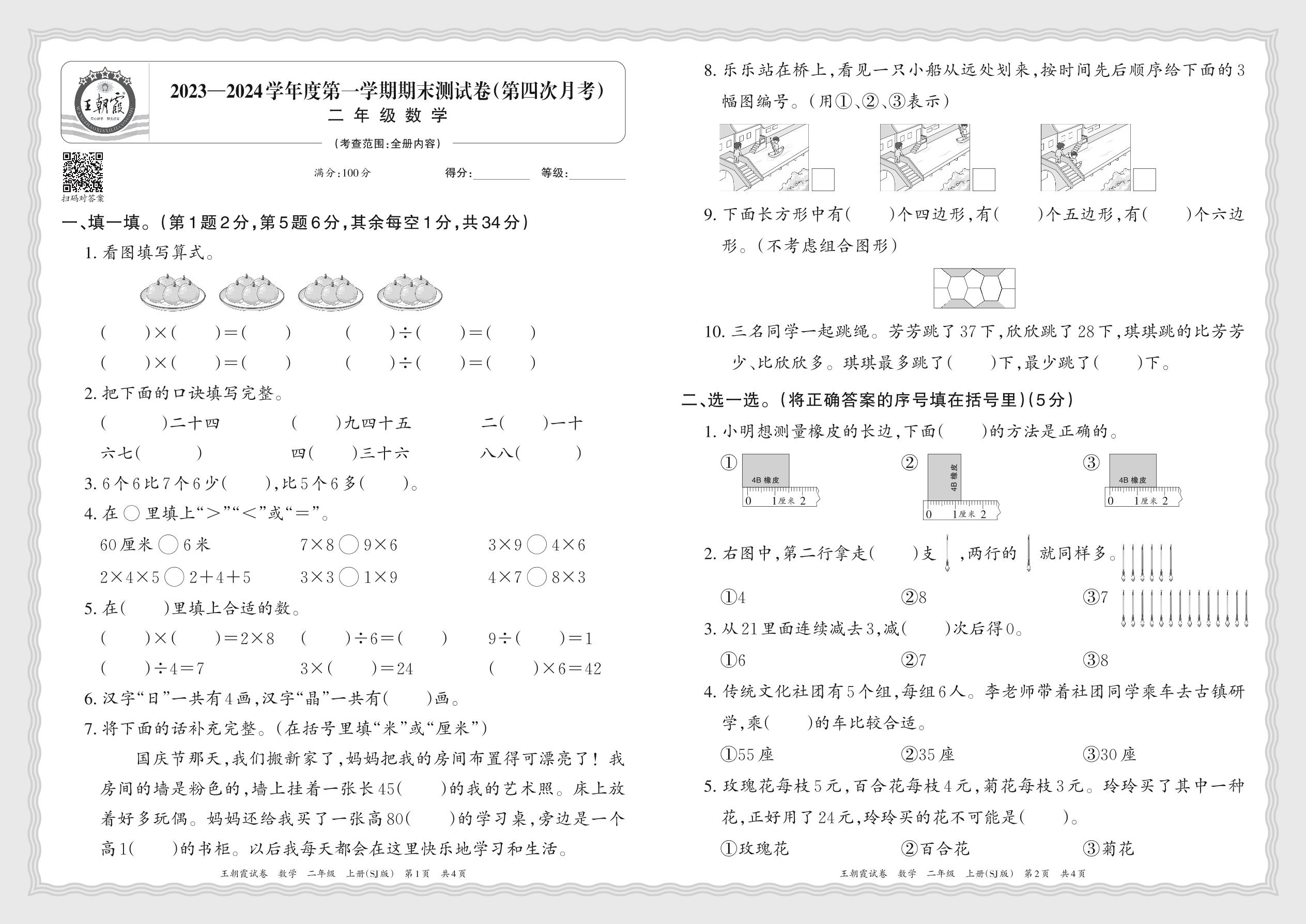 2023—2024学年度第一学期期末测试卷(第四次月考)二年级数学(苏教版)