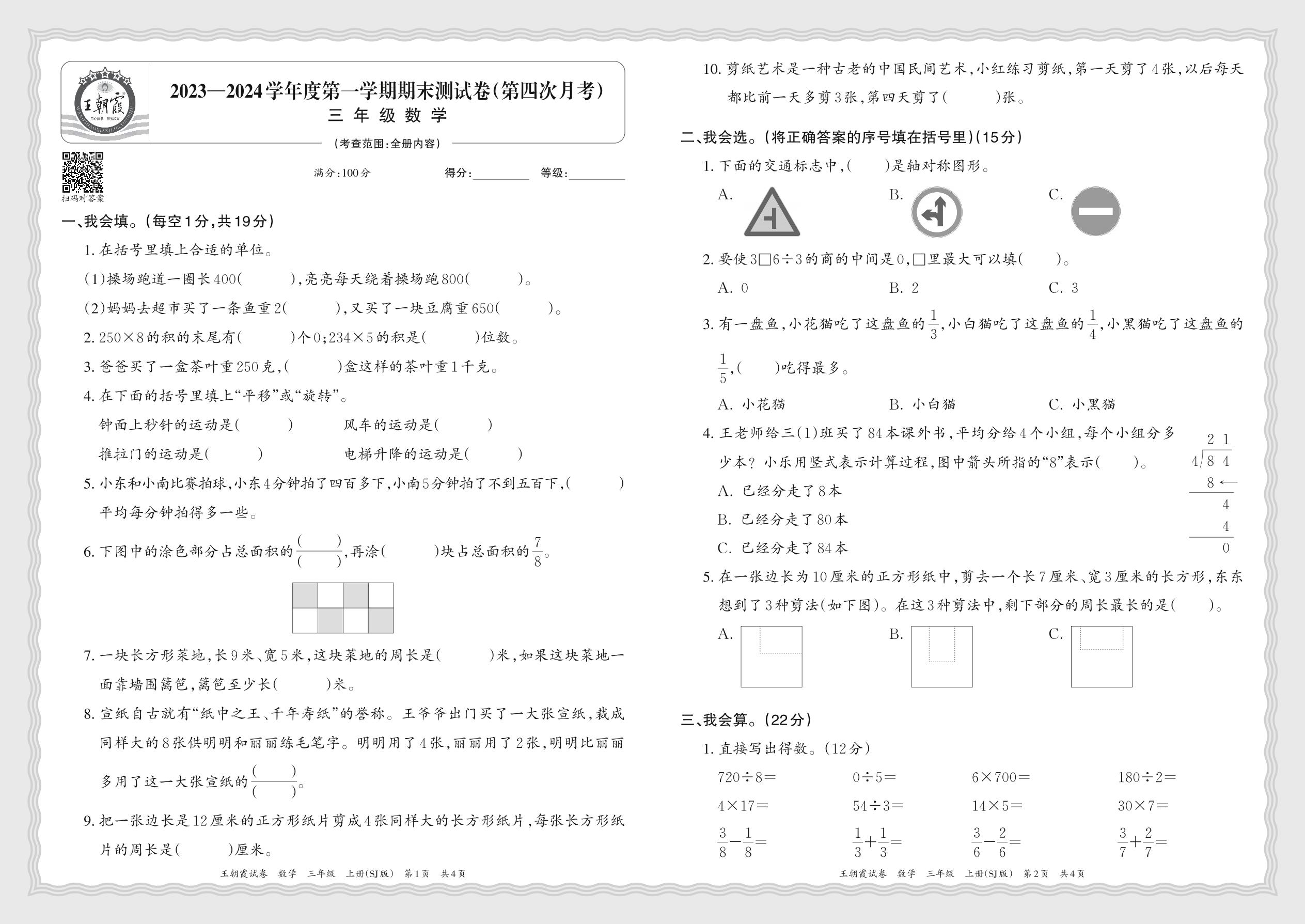 2023—2024学年度第一学期期末测试卷(第四次月考)三年级数学(苏教版)