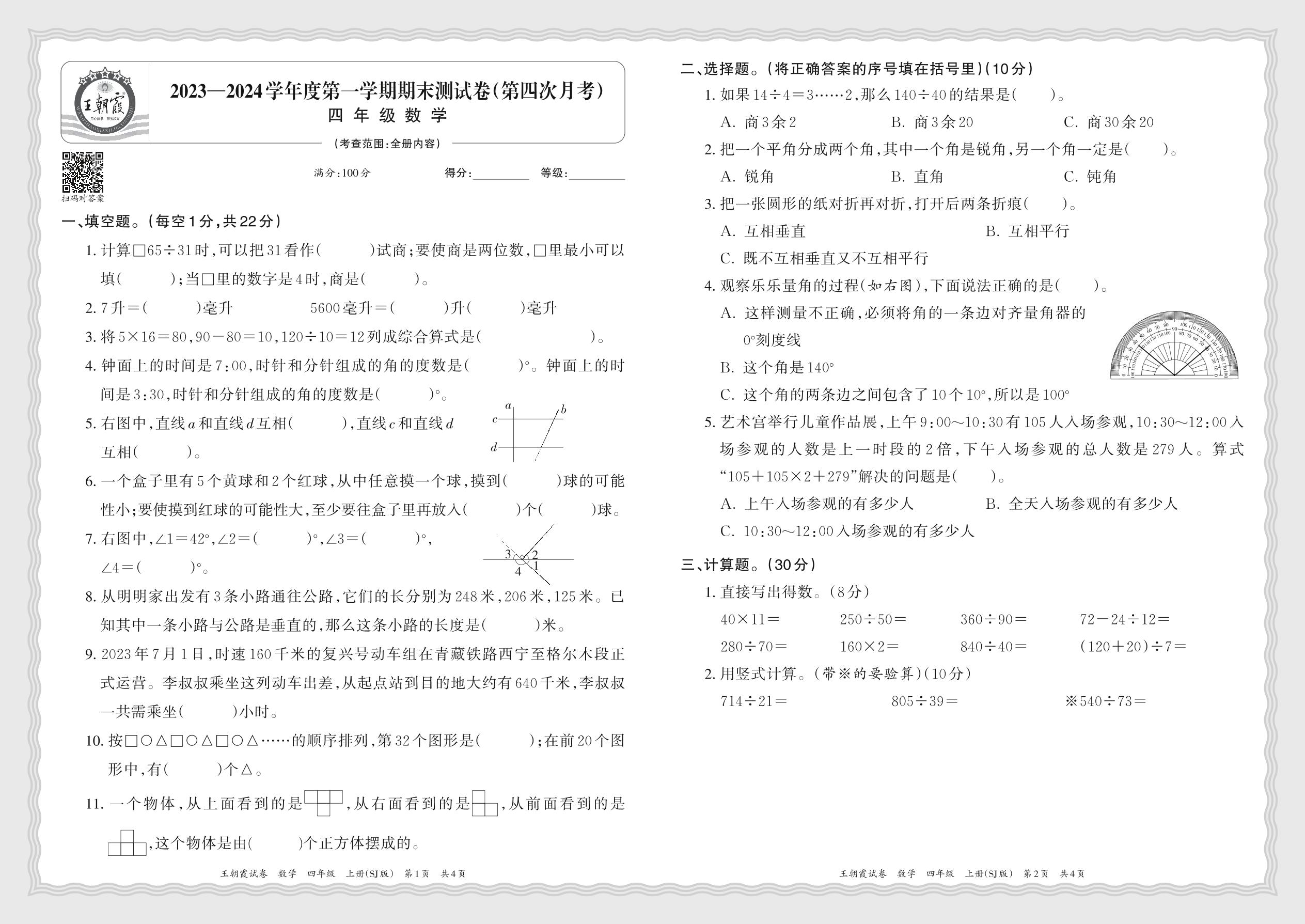 2023—2024学年度第一学期期末测试卷(第四次月考)四年级数学(苏教版)