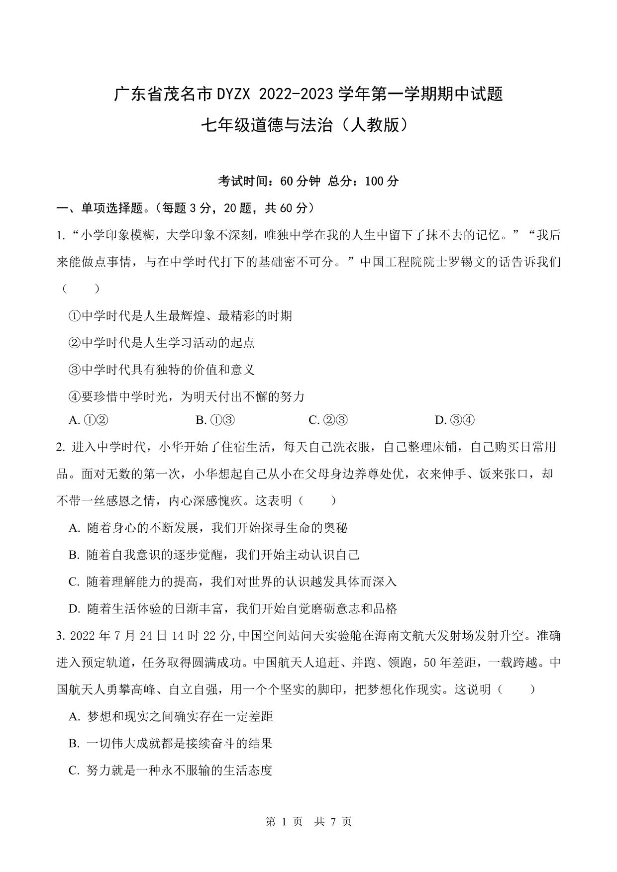 广东省茂名市DYZX2022-2023学年第一学期期中试题七年级道德与法治(人教版)