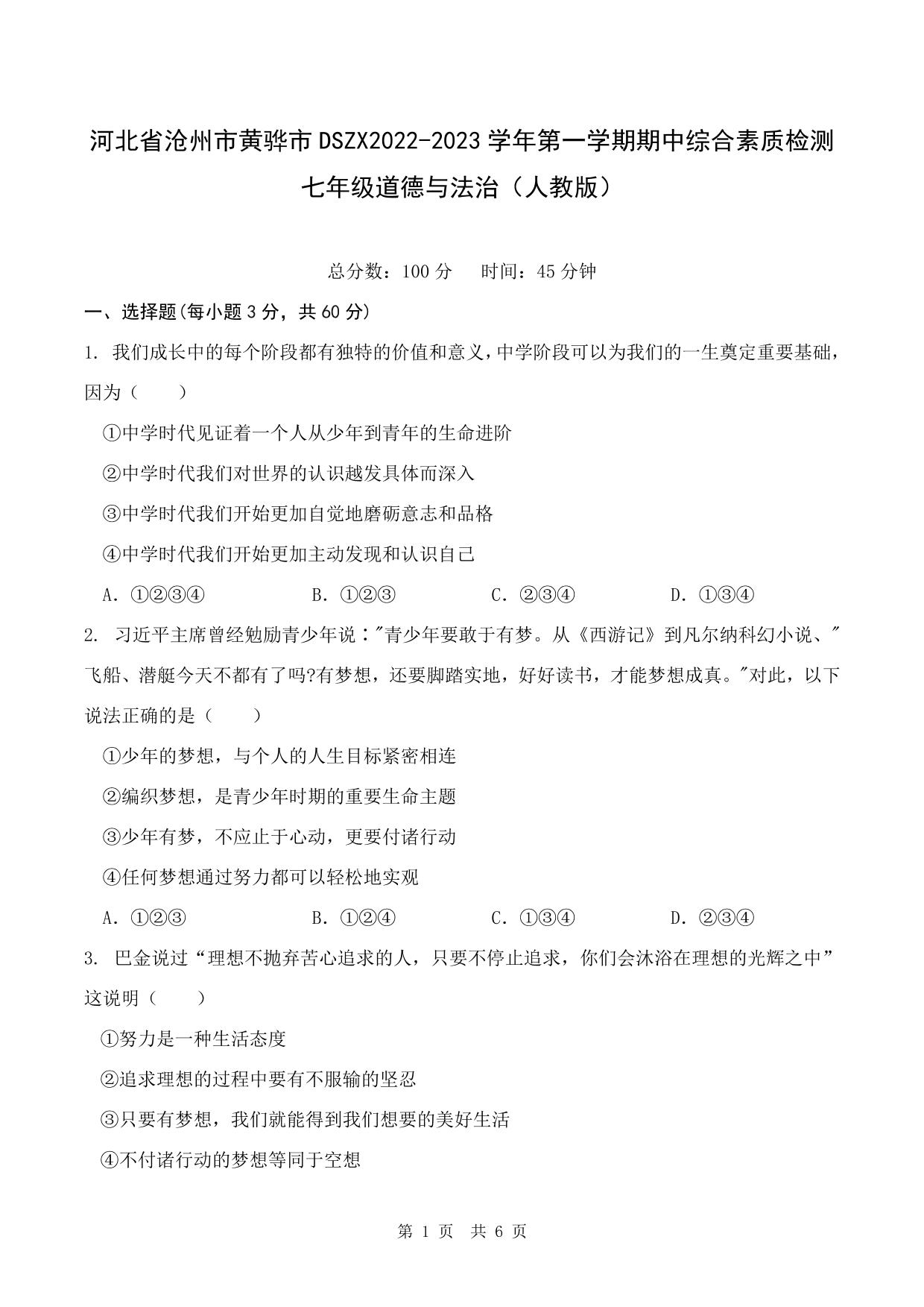 河北省沧州市黄骅市DSZX2022-2023学年第一学期期中综合素质检测七年级道德与法治(人教版)