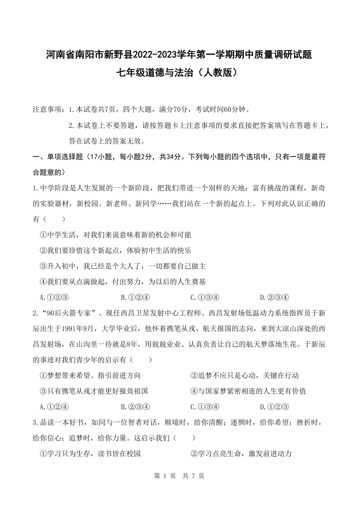 河南省南阳市新野县2022-2023学年第一学期期中质量调研试题七年级道德与法治(人教版)