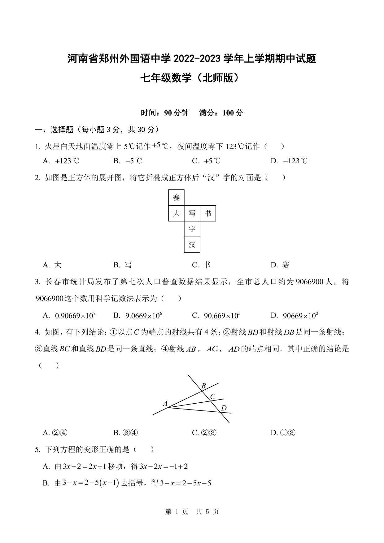 河南省郑州外国语中学2022-2023学年上学期期中试题七年级数学(北师版)