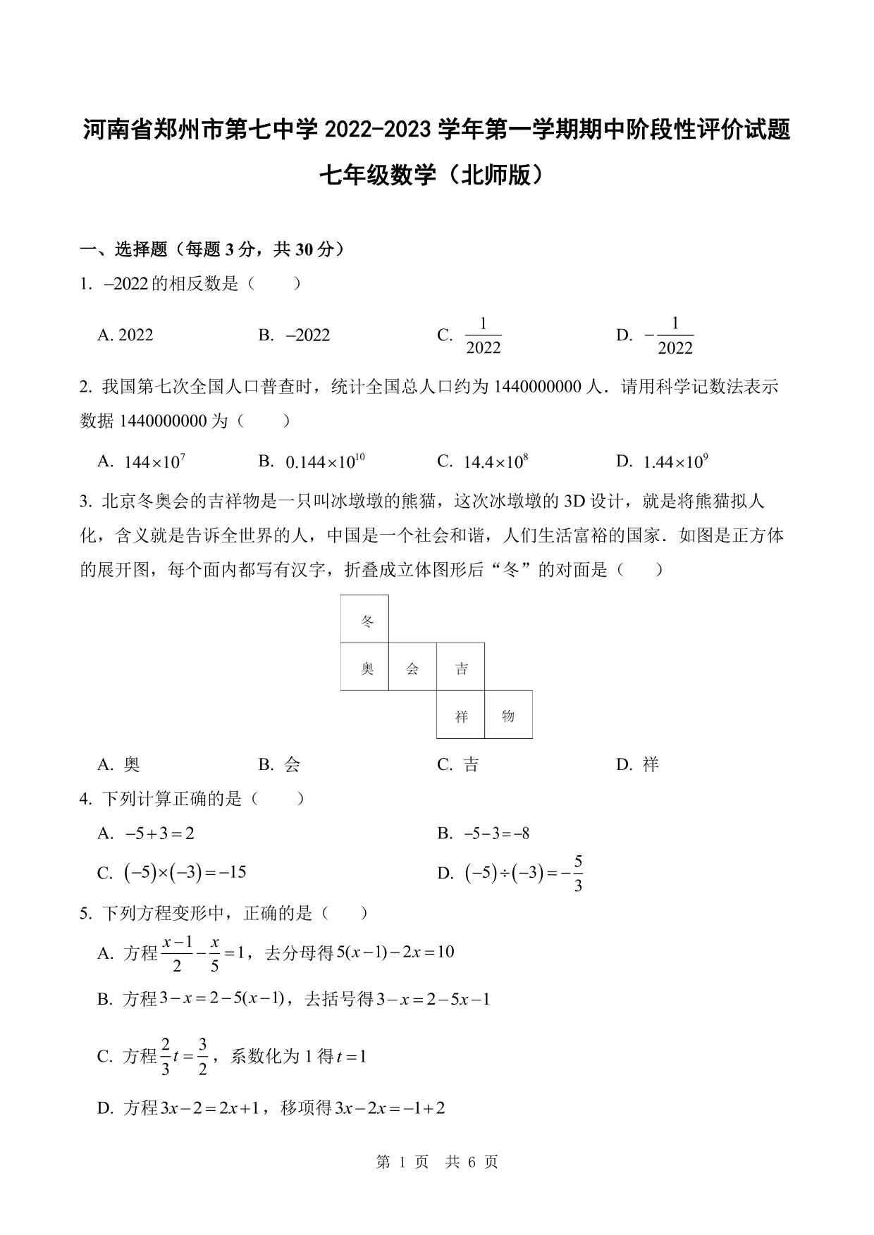 河南省郑州市第七中学2022-2023学年第一学期期中阶段性评价试题七年级数学(北师版)