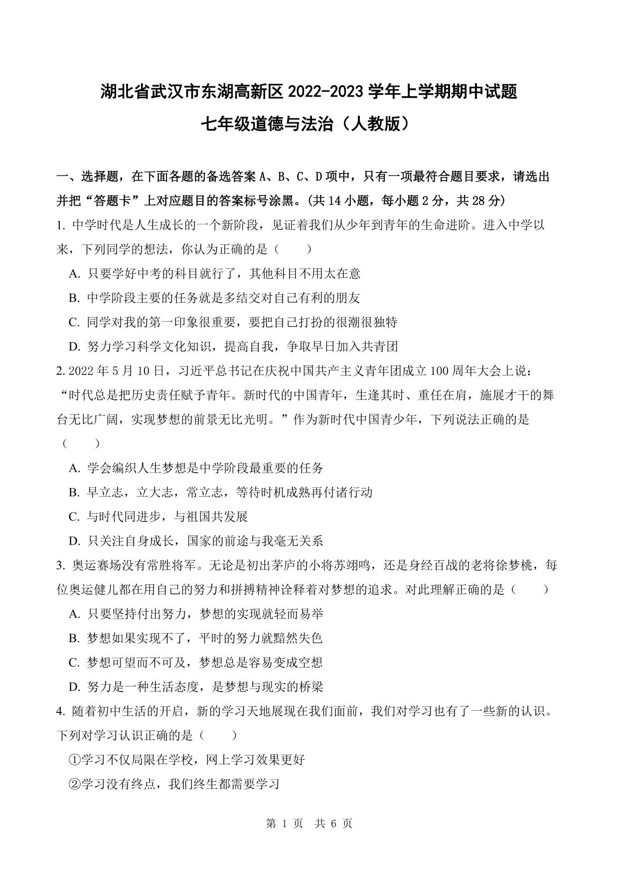 湖北省武汉市东湖高新区2022-2023学年上学期期中试题七年级道德与法治(人教版)