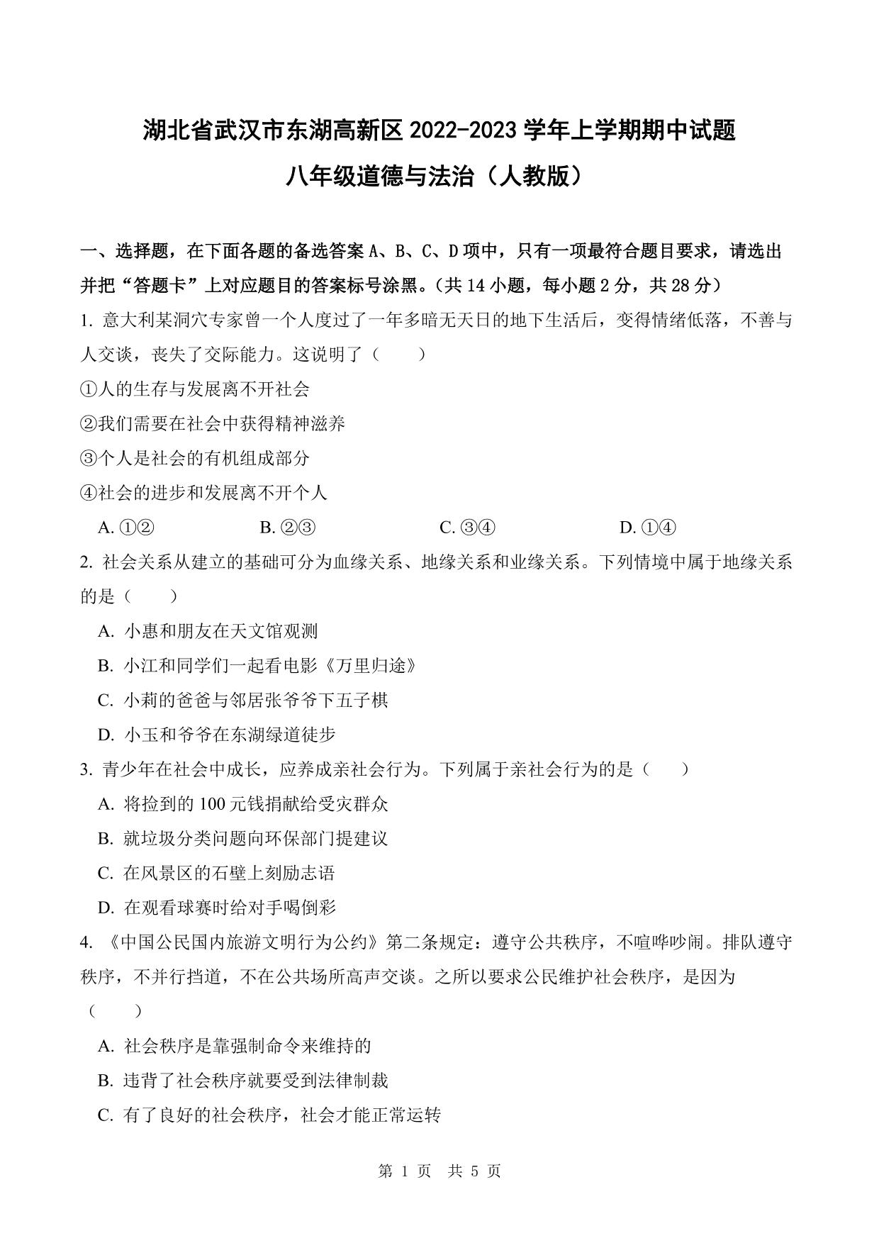 湖北省武汉市东湖高新区2022-2023学年上学期期中试题八年级道德与法治(人教版)