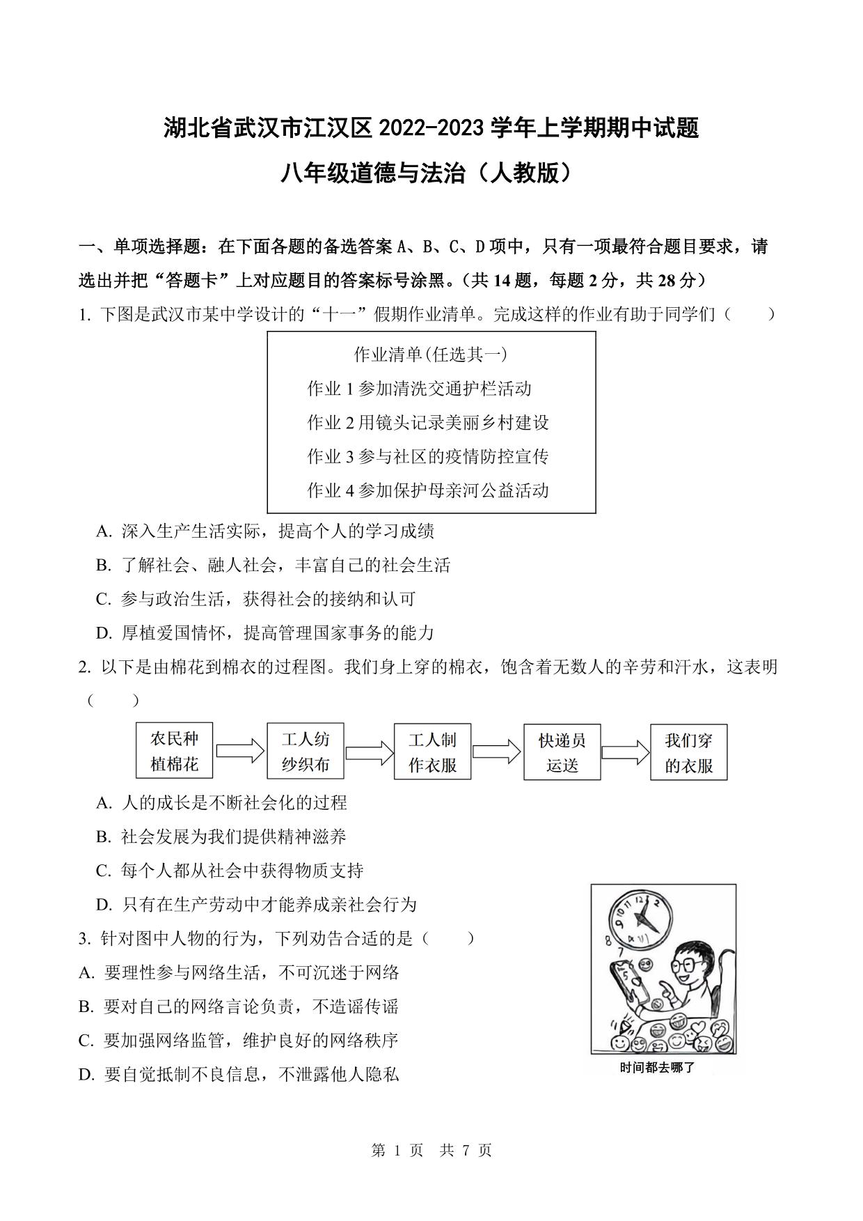 湖北省武汉市江汉区2022-2023学年上学期期中试题八年级道德与法治(人教版)