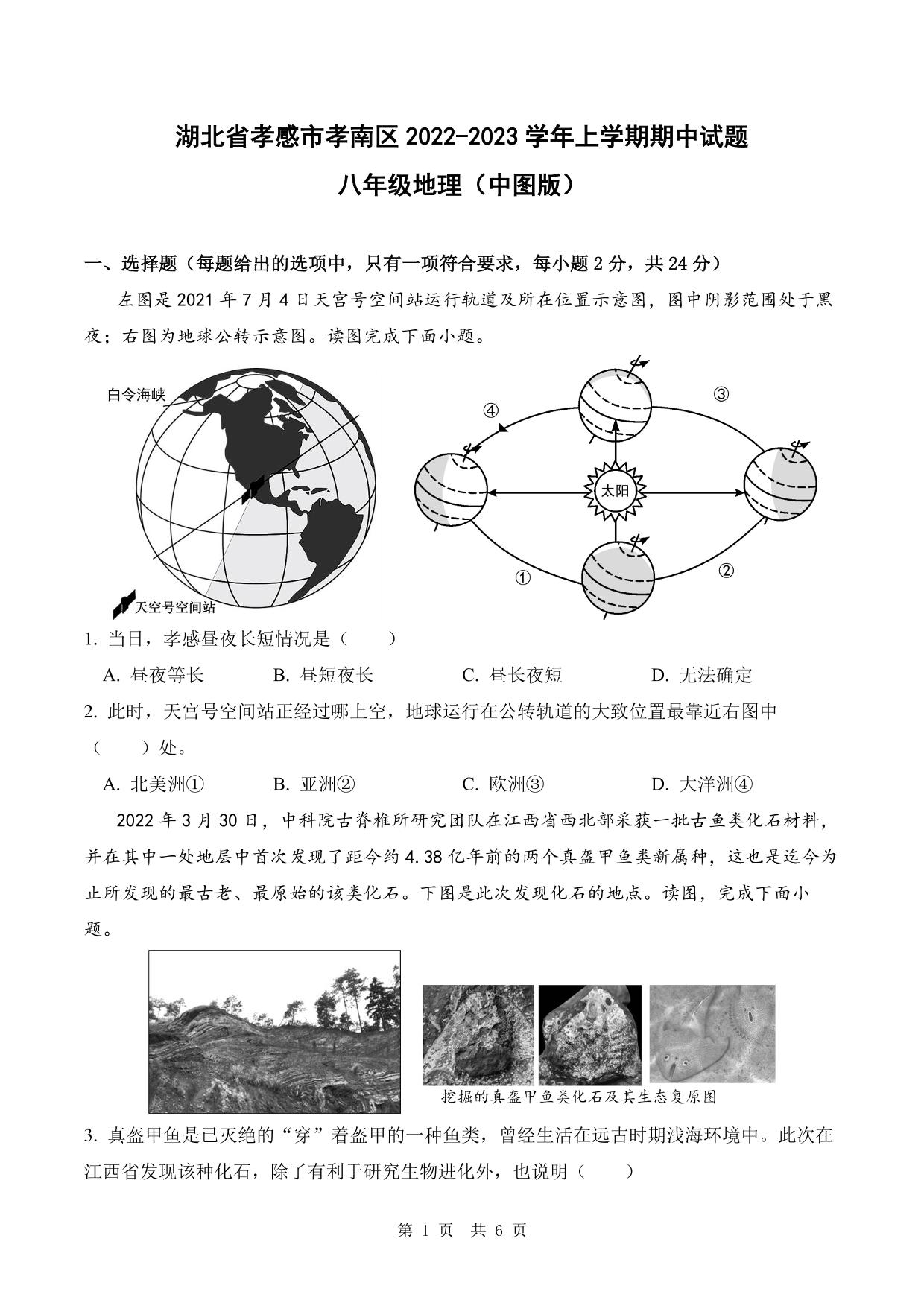 湖北省孝感市孝南区2022-2023学年上学期期中试题八年级地理(中图版)